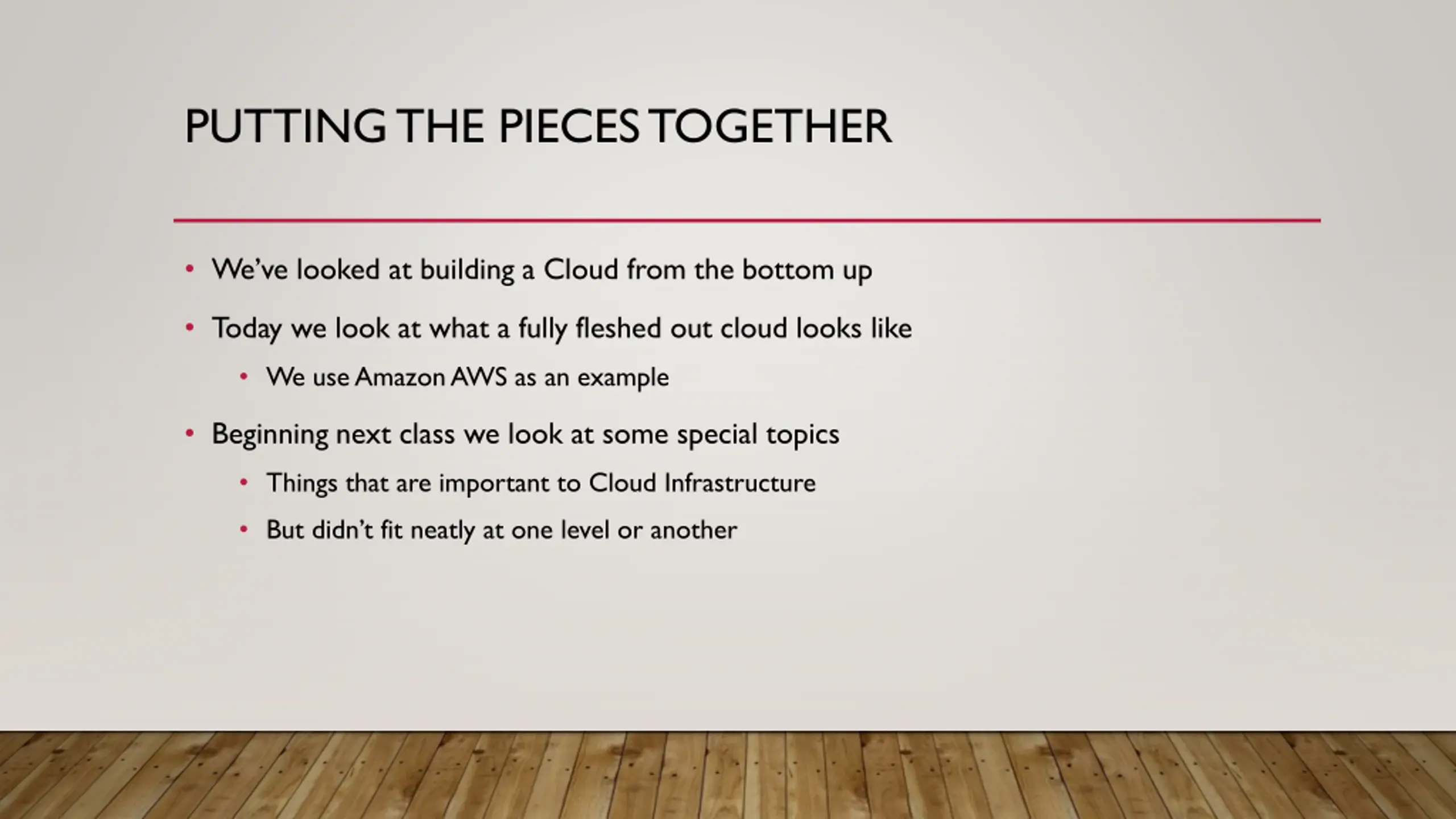 PUTTING THE PIECES TOGETHER We ve looked at building a Cloud from the bottom up Today we look at what a fully fleshed out cloud looks like We use Amazon AWS as an example Beginning next class we look at some special topics Things that are important to Cloud Infrastructure But didn t fit neatly at one level or another
