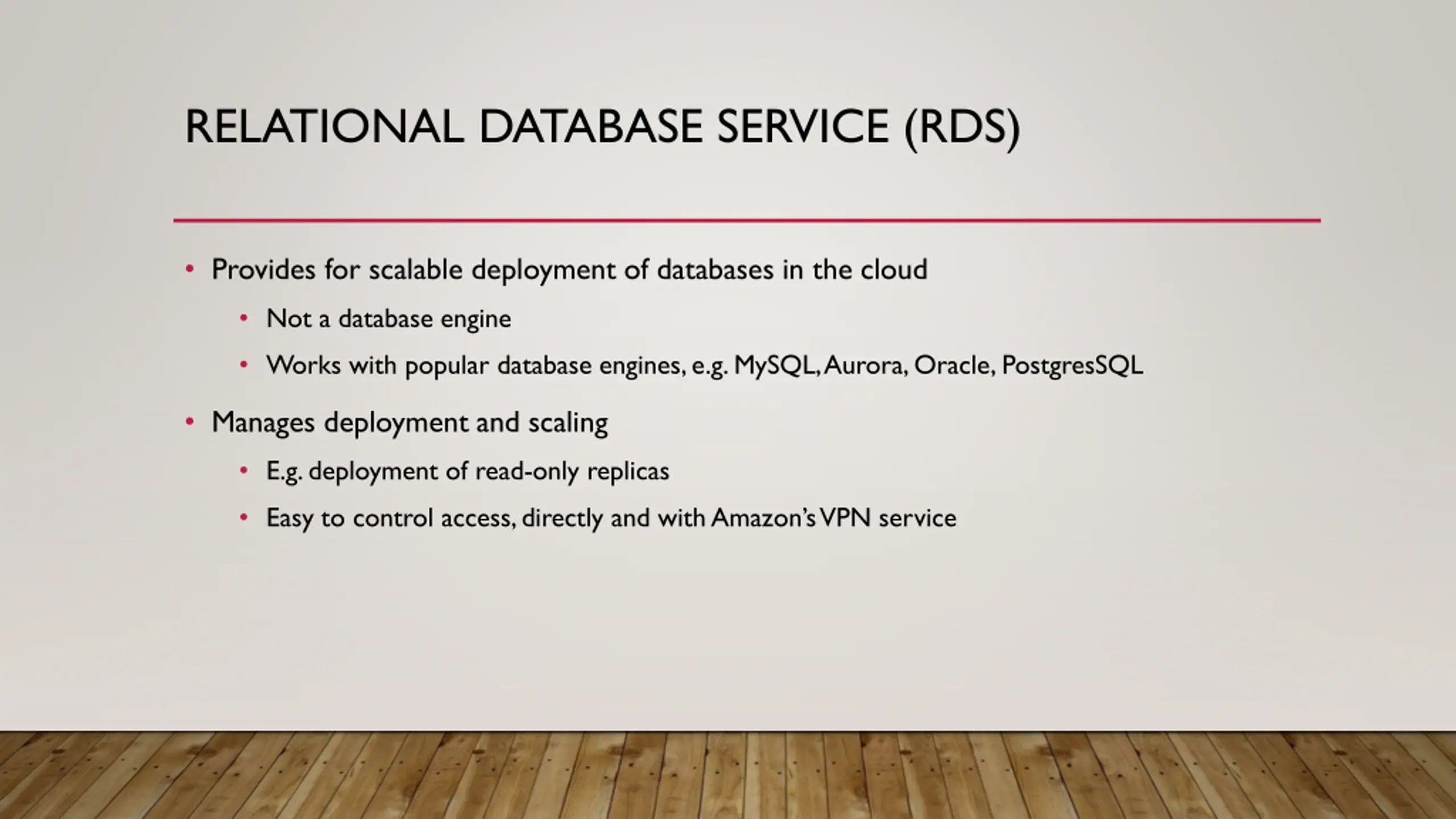 RELATIONAL DATABASE SERVICE (RDS) Provides for scalable deployment of databases in the cloud Not a database engine Works with popular database engines, e.g. MySQL, Aurora, Oracle, PostgresSQL Manages deployment and scaling E.g. deployment of read-only replicas Easy to control access, directly and with Amazon s VPN service