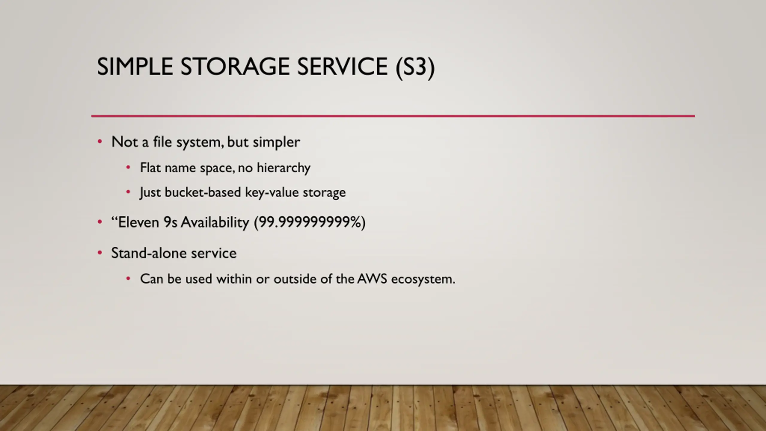 SIMPLE STORAGE SERVICE (S3) Not a file system, but simpler Flat name space, no hierarchy Just bucket-based key-value storage Eleven 9s Availability (99.999999999%) Stand-alone service Can be used within or outside of the AWS ecosystem.