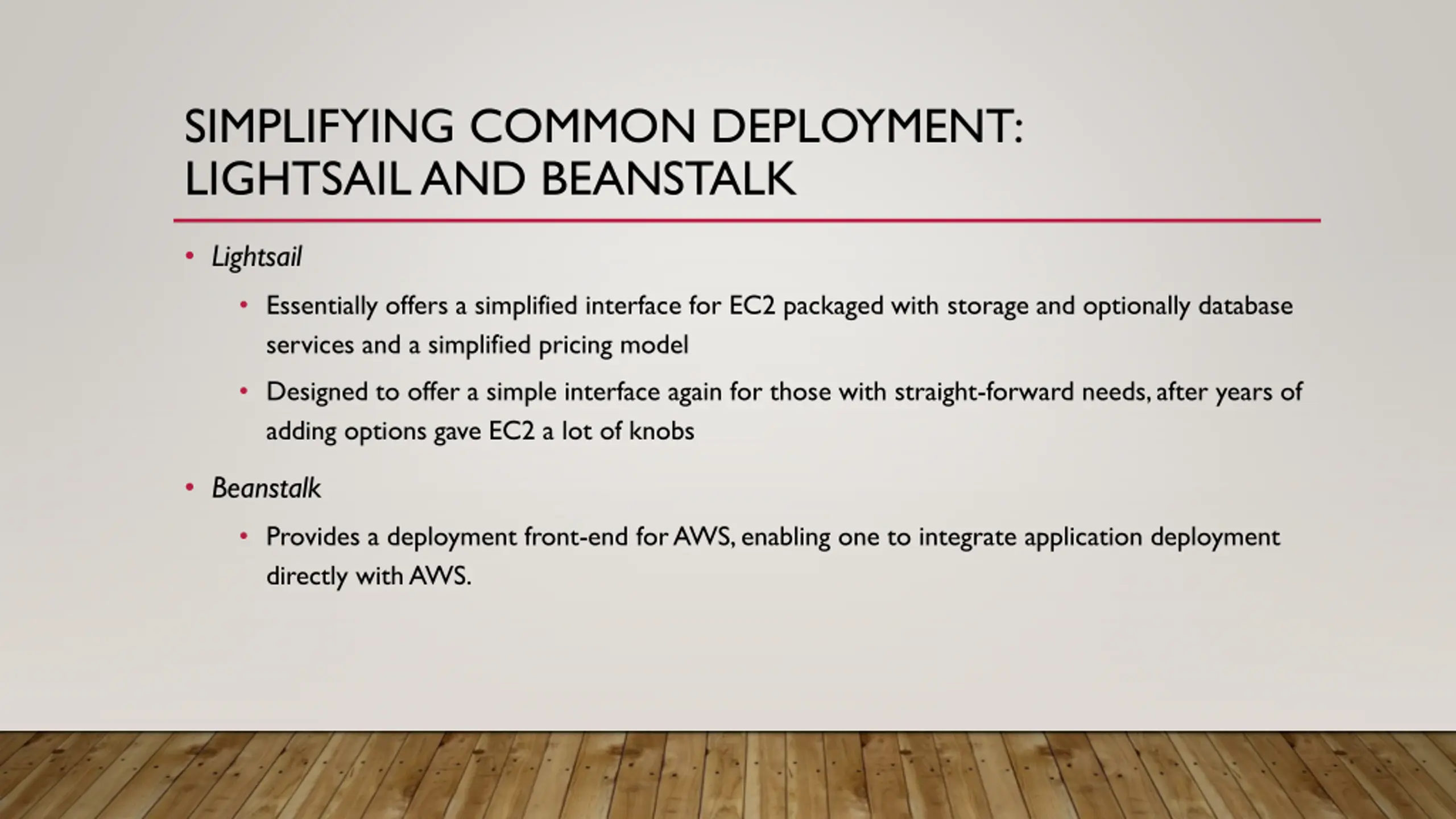 SIMPLIFYING COMMON DEPLOYMENT: LIGHTSAILAND BEANSTALK Lightsail Essentially offers a simplified interface for EC2 packaged with storage and optionally database services and a simplified pricing model Designed to offer a simple interface again for those with straight-forward needs, after years of adding options gave EC2 a lot of knobs Beanstalk Provides a deployment front-end for AWS, enabling one to integrate application deployment directly with AWS.