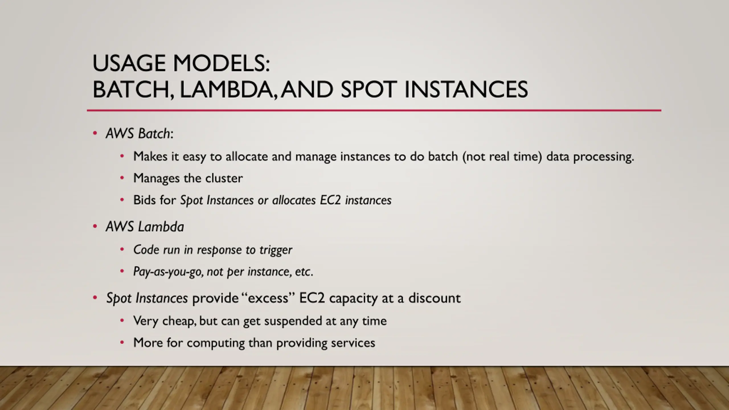 USAGE MODELS: BATCH, LAMBDA, AND SPOT INSTANCES AWS Batch: Makes it easy to allocate and manage instances to do batch (not real time) data processing. Manages the cluster Bids for Spot Instances or allocates EC2 instances AWS Lambda Code run in response to trigger Pay-as-you-go, not per instance, etc. Spot Instances provide excess EC2 capacity at a discount Very cheap, but can get suspended at any time More for computing than providing services
