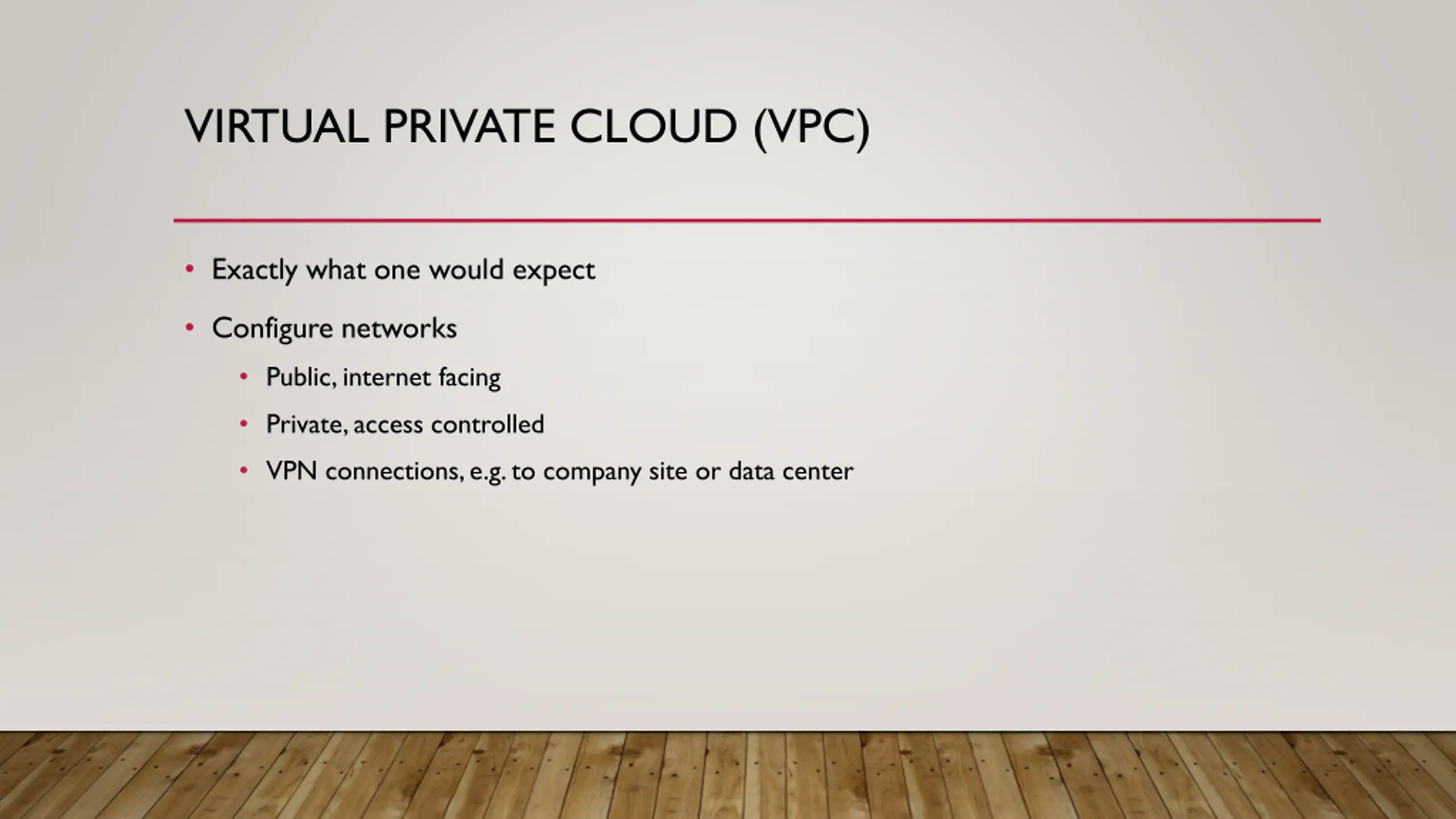 VIRTUAL PRIVATE CLOUD (VPC) Exactly what one would expect Configure networks Public, internet facing Private, access controlled VPN connections, e.g. to company site or data center