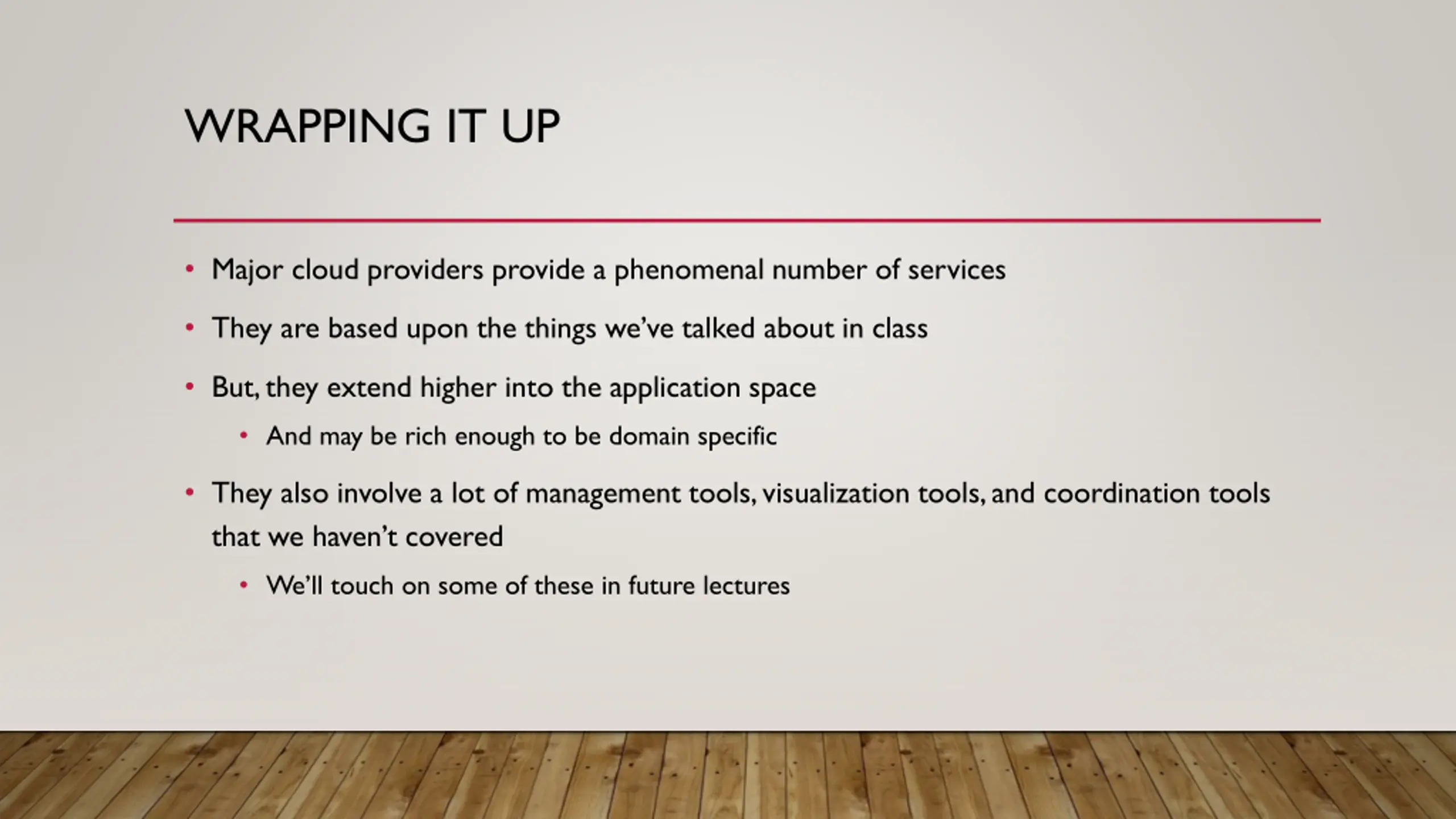 WRAPPING IT UP Major cloud providers provide a phenomenal number of services They are based upon the things we ve talked about in class But, they extend higher into the application space And may be rich enough to be domain specific They also involve a lot of management tools, visualization tools, and coordination tools that we haven t covered We ll touch on some of these in future lectures