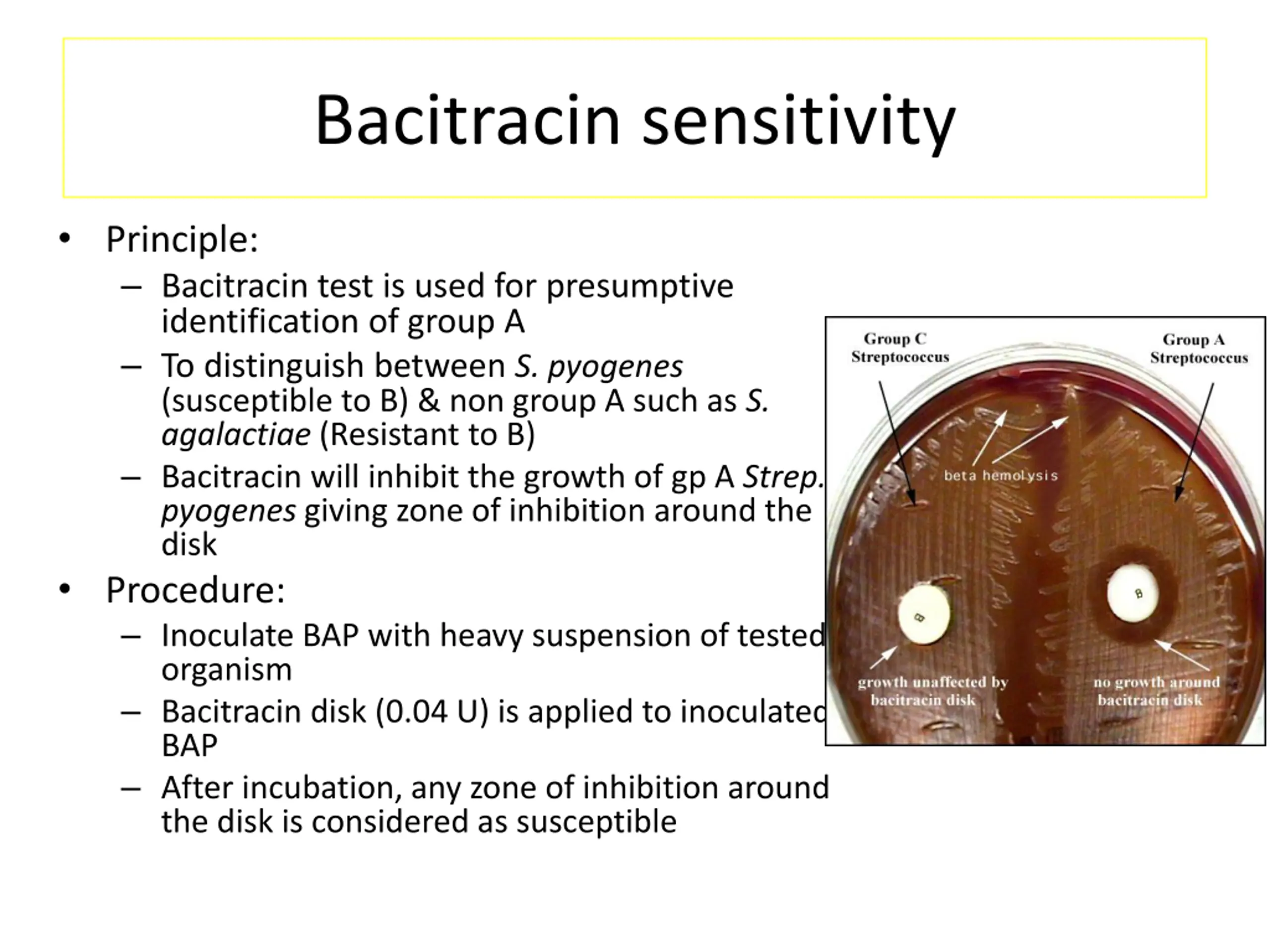 Bacitracin sensitivity Principle: Bacitracin test is used for presumptive identification of group A To distinguish between S. pyogenes (susceptible to B) & non group A such as S. agalactiae (Resistant to B) Bacitracin will inhibit the growth of gp A Strep. pyogenes giving zone of inhibition around the disk Procedure: Inoculate BAP with heavy suspension of tested organism Bacitracin disk (0.04 U) is applied to inoculated BAP After incubation, any zone of inhibition around the disk is considered as susceptible