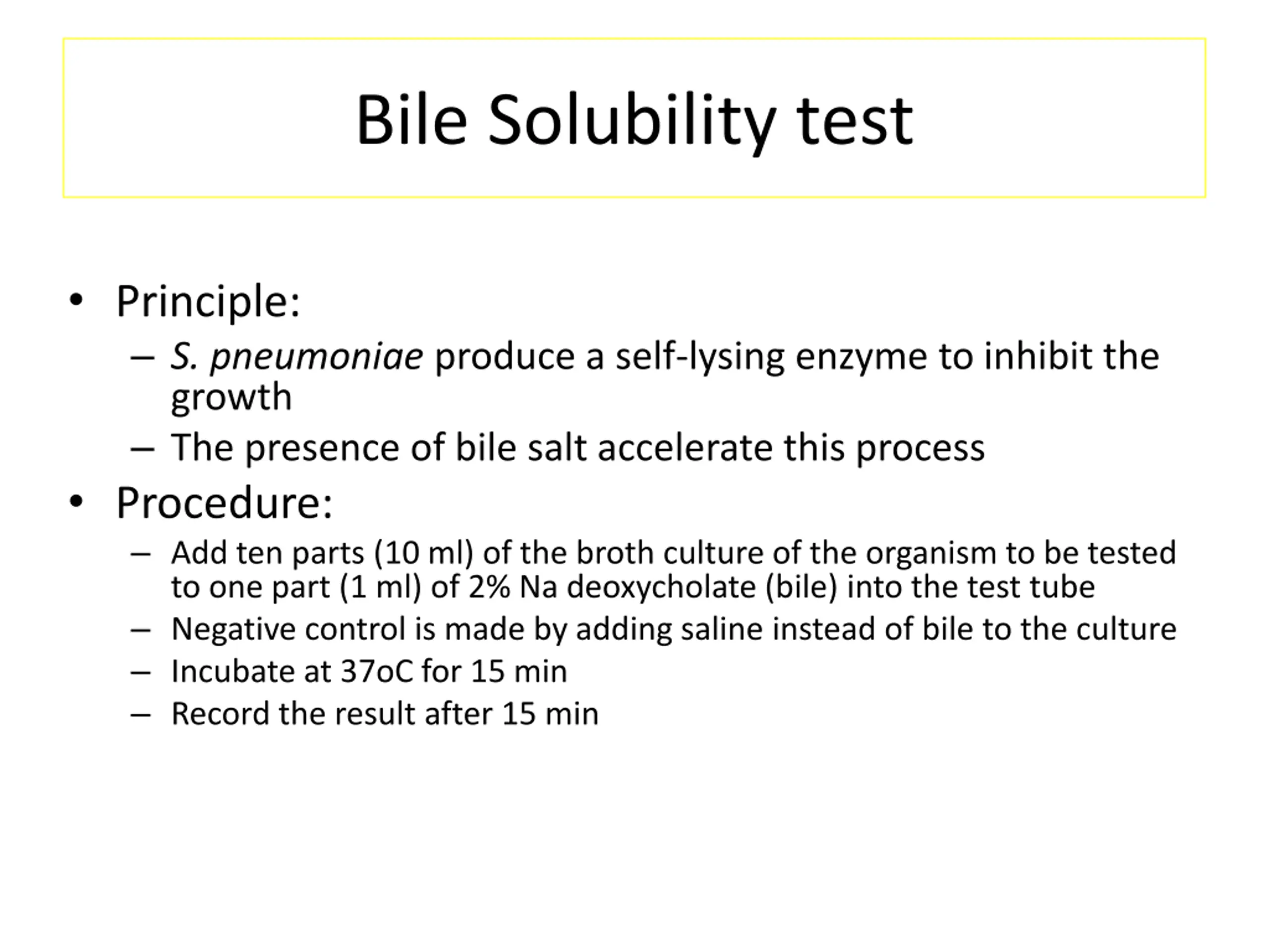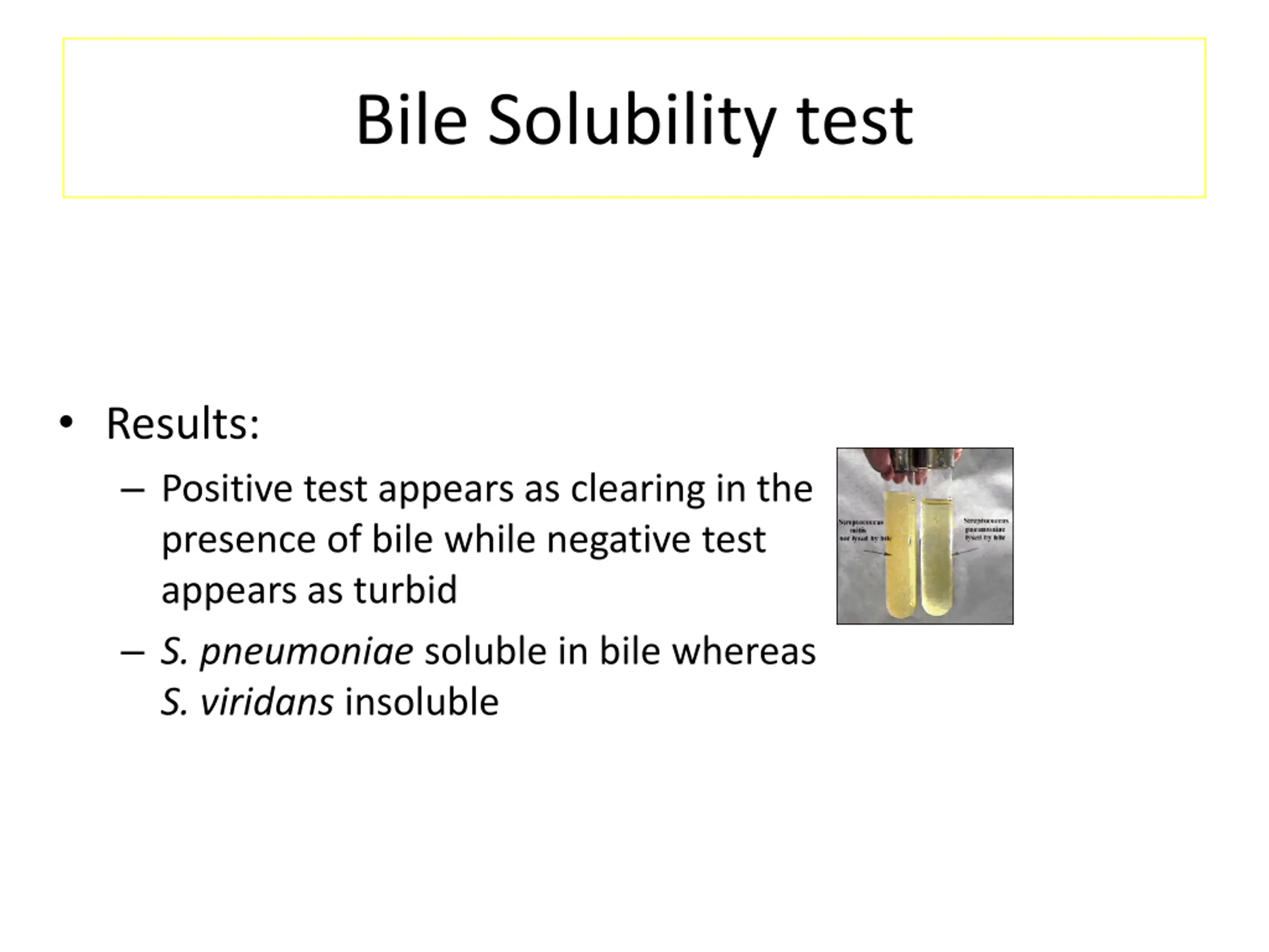 Bile Solubility test Results: Positive test appears as clearing in the presence of bile while negative test appears as turbid S. pneumoniae soluble in bile whereas S. viridans insoluble