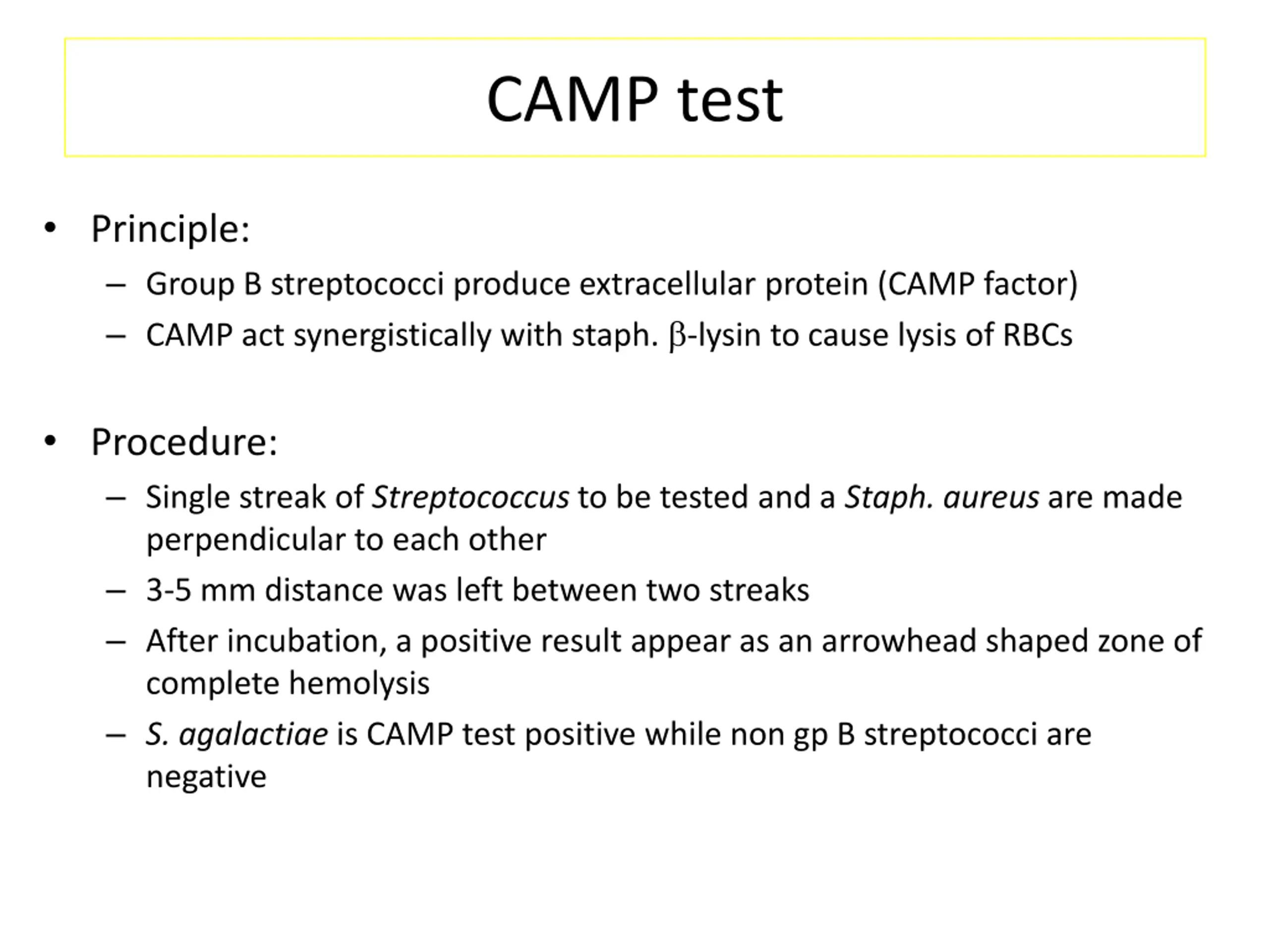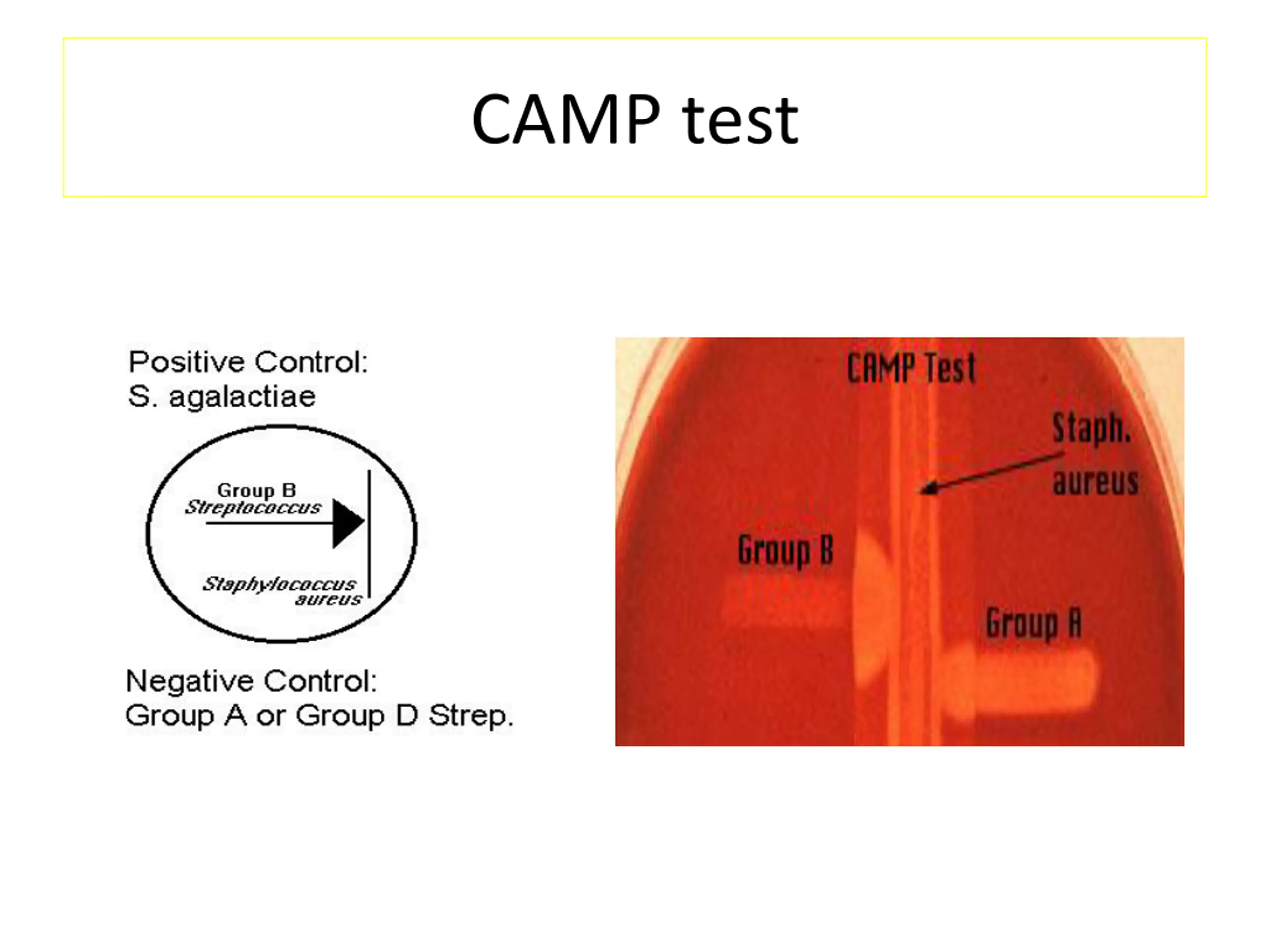 CAMP test Principle: Group B streptococci produce extracellular protein (CAMP factor) CAMP act synergistically with staph. -lysin to cause lysis of RBCs Procedure: Single streak of Streptococcus to be tested and a Staph. aureus are made perpendicular to each other 3-5 mm distance was left between two streaks After incubation, a positive result appear as an arrowhead shaped zone of complete hemolysis S. agalactiae is CAMP test positive while non gp B streptococci are negative