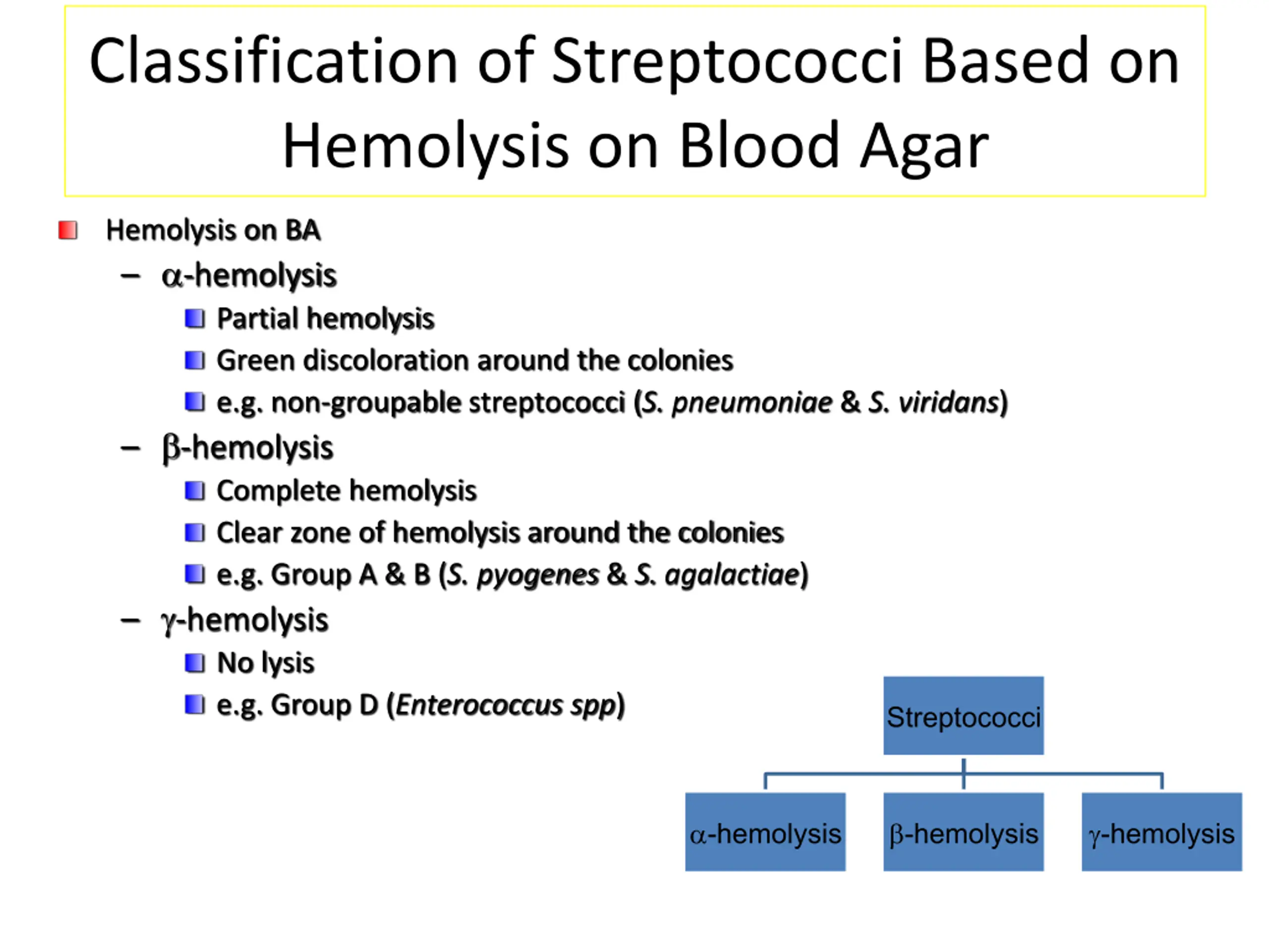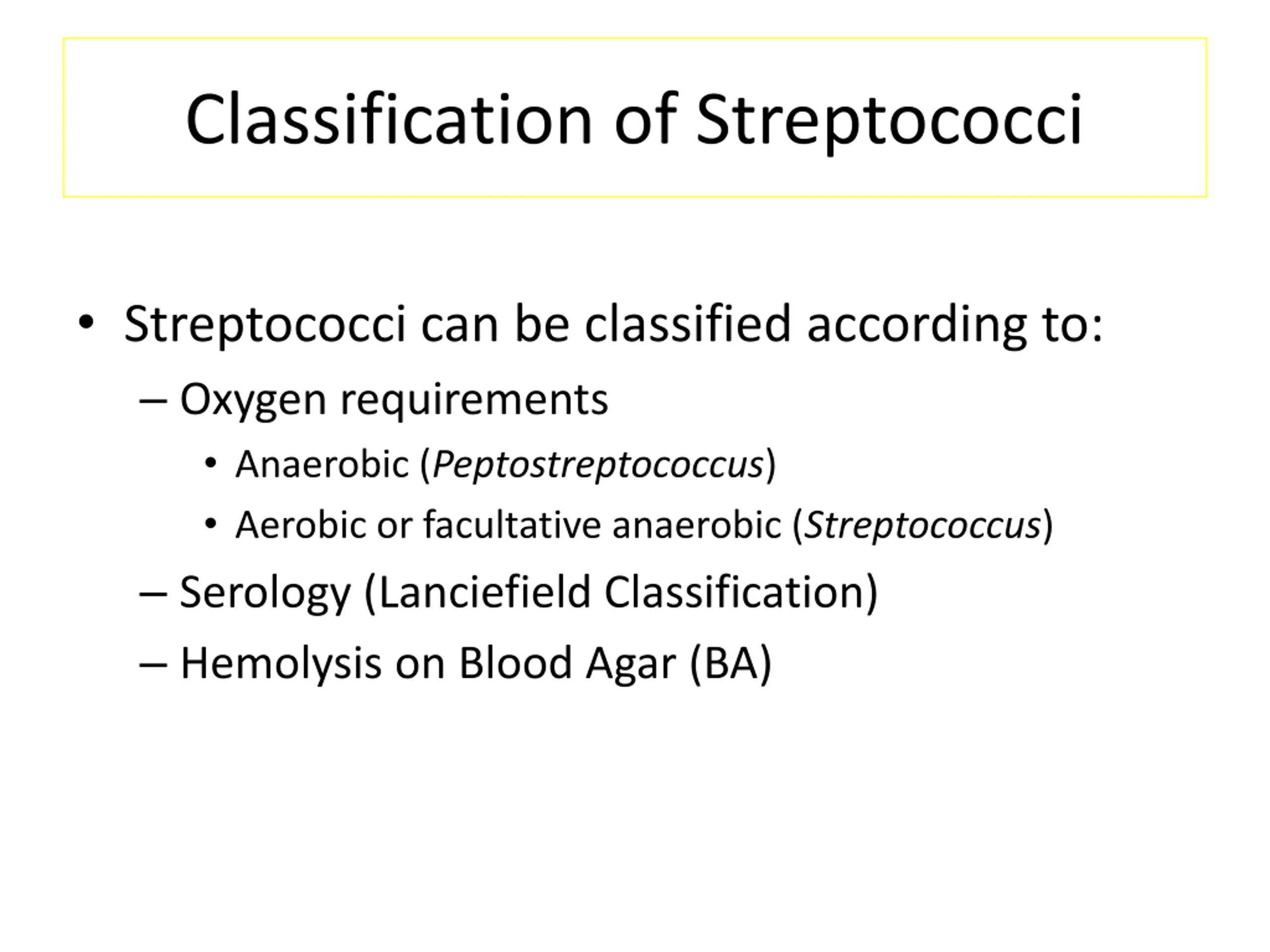 Classification of Streptococci Streptococci can be classified according to: Oxygen requirements Anaerobic (Peptostreptococcus) Aerobic or facultative anaerobic (Streptococcus) Serology (Lanciefield Classification) Hemolysis on Blood Agar (BA)