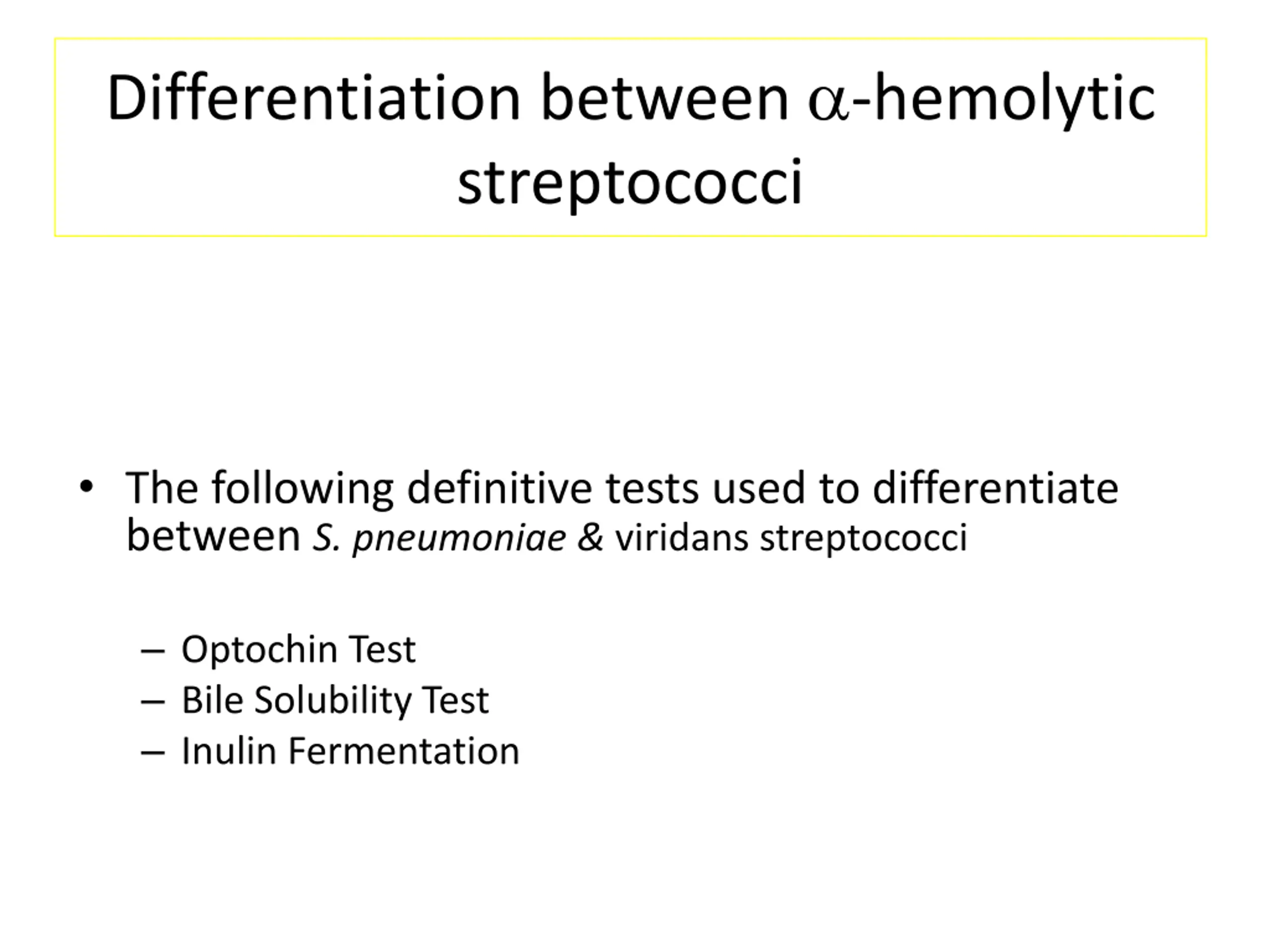 Differentiation between -hemolytic streptococci The following definitive tests used to differentiate between S. pneumoniae & viridans streptococci Optochin Test Bile Solubility Test Inulin Fermentation