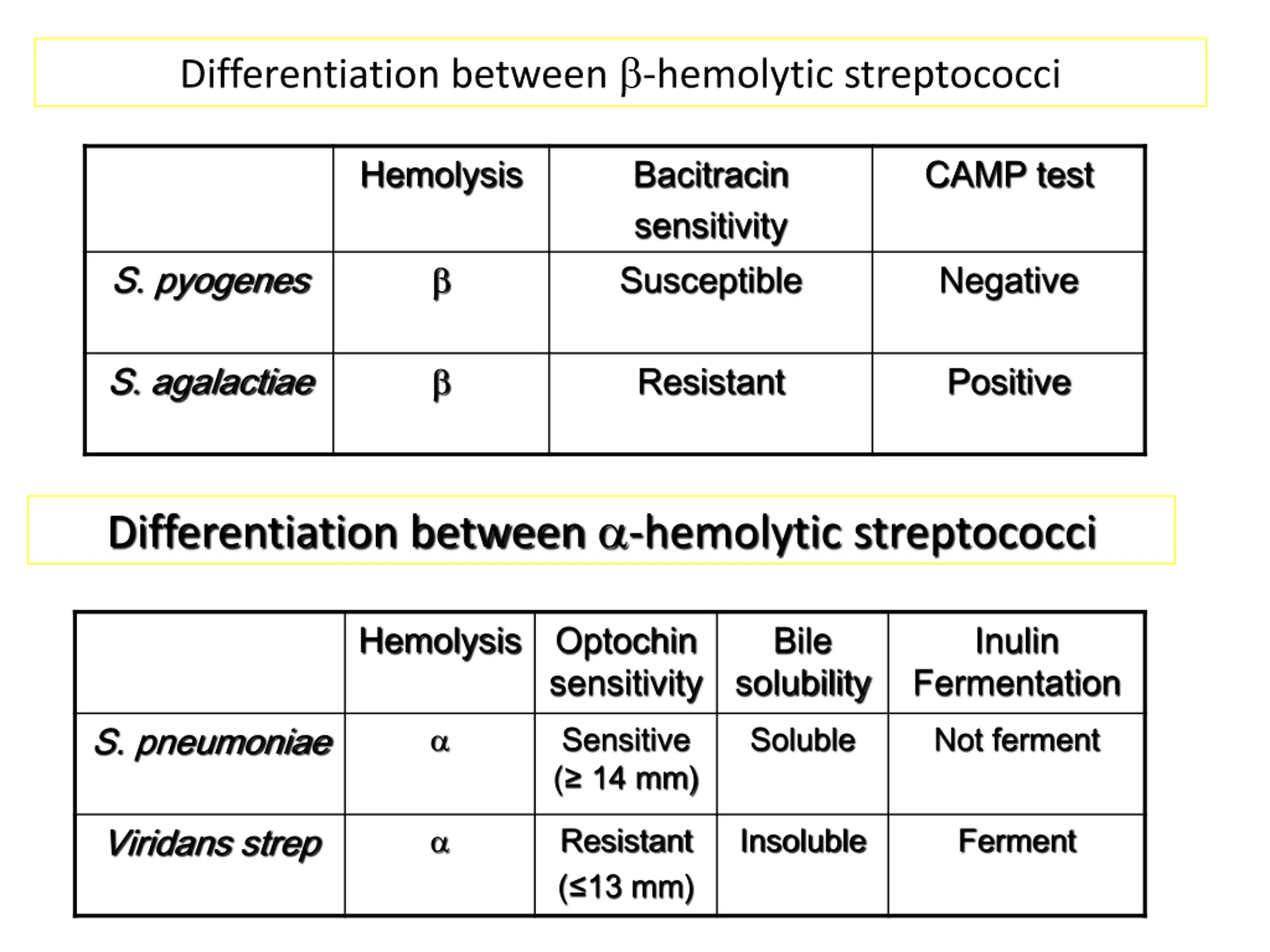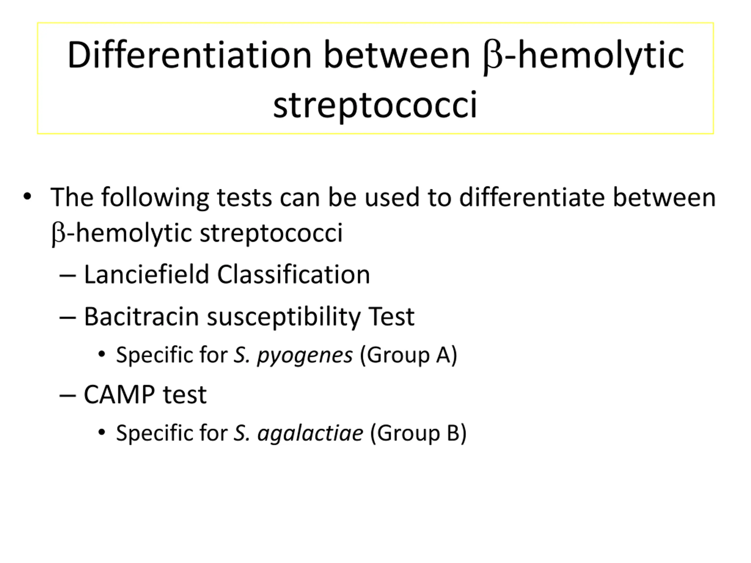 Differentiation between -hemolytic streptococci The following tests can be used to differentiate between -hemolytic streptococci Lanciefield Classification Bacitracin susceptibility Test Specific for S. pyogenes (Group A) CAMP test Specific for S. agalactiae (Group B)