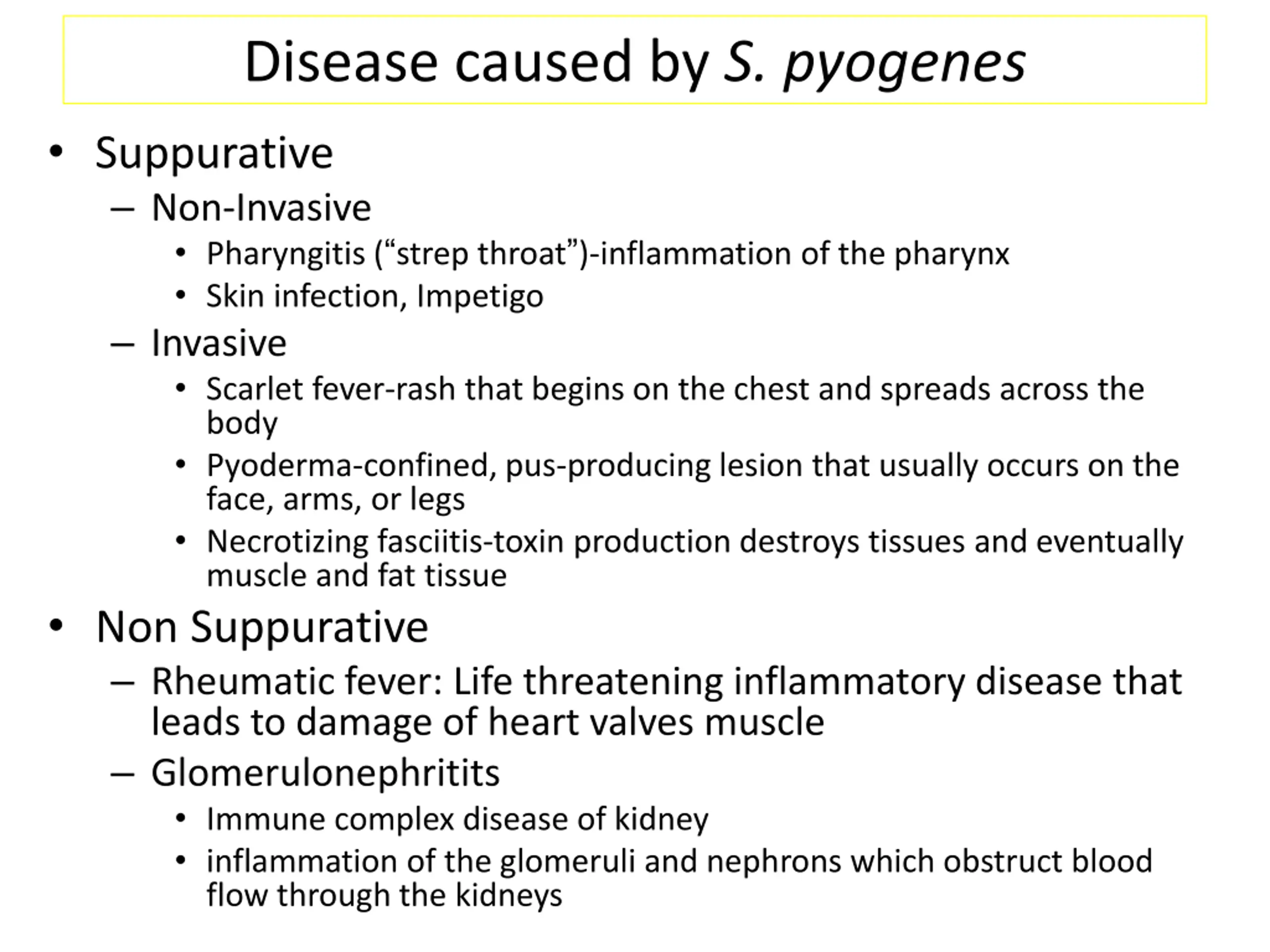 Disease caused by S. pyogenes Suppurative Non-Invasive Pharyngitis ( strep throat )-inflammation of the pharynx Skin infection, Impetigo Invasive Scarlet fever-rash that begins on the chest and spreads across the body Pyoderma-confined, pus-producing lesion that usually occurs on the face, arms, or legs Necrotizing fasciitis-toxin production destroys tissues and eventually muscle and fat tissue Non Suppurative Rheumatic fever: Life threatening inflammatory disease that leads to damage of heart valves muscle Glomerulonephritits Immune complex disease of kidney inflammation of the glomeruli and nephrons which obstruct blood flow through the kidneys