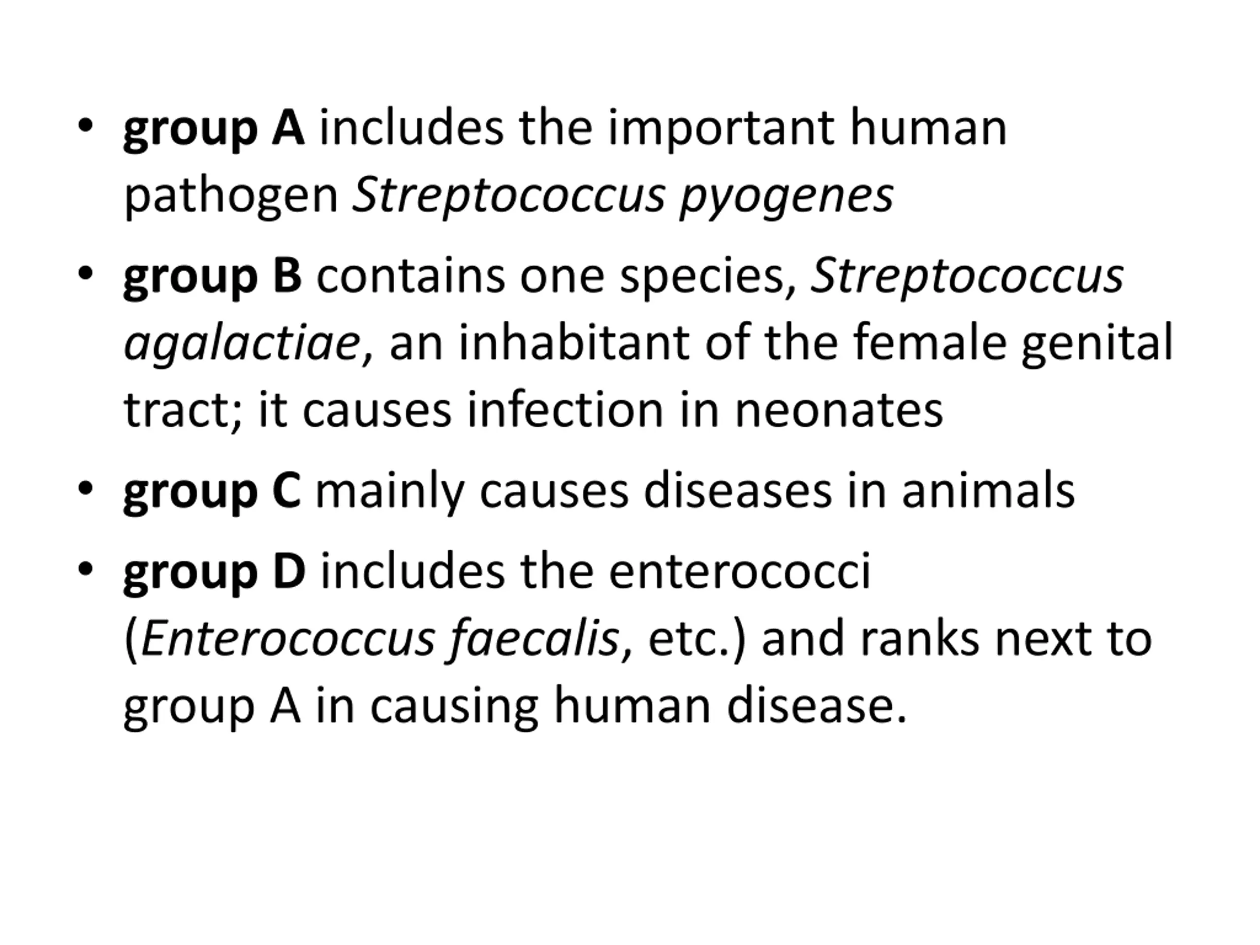 group A includes the important human pathogen Streptococcus pyogenes group B contains one species, Streptococcus agalactiae, an inhabitant of the female genital tract; it causes infection in neonates group C mainly causes diseases in animals group D includes the enterococci (Enterococcus faecalis, etc.) and ranks next to group A in causing human disease.