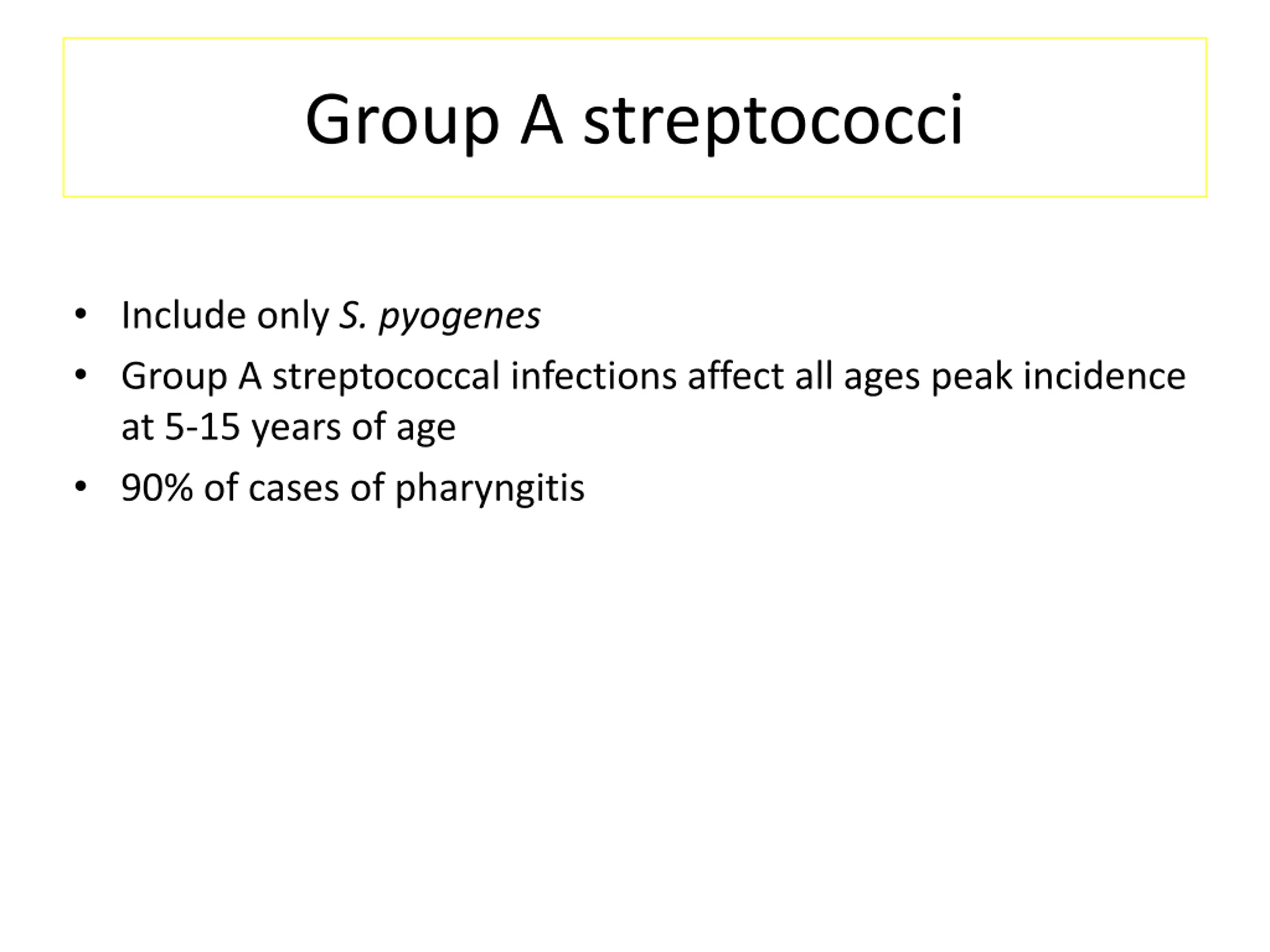 Group A streptococci Include only S. pyogenes Group A streptococcal infections affect all ages peak incidence at 5-15 years of age 90% of cases of pharyngitis