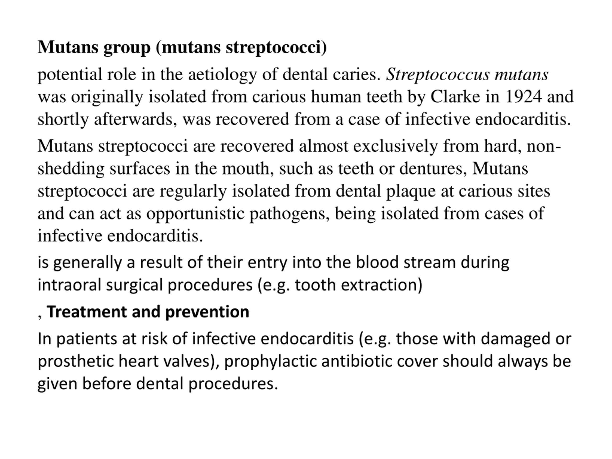 Mutans group (mutans streptococci) potential role in the aetiology of dental caries. Streptococcus mutans was originally isolated from carious human teeth by Clarke in 1924 and shortly afterwards, was recovered from a case of infective endocarditis. Mutans streptococci are recovered almost exclusively from hard, non- shedding surfaces in the mouth, such as teeth or dentures, Mutans streptococci are regularly isolated from dental plaque at carious sites and can act as opportunistic pathogens, being isolated from cases of infective endocarditis. is generally a result of their entry into the blood stream during intraoral surgical procedures (e.g. tooth extraction) , Treatment and prevention In patients at risk of infective endocarditis (e.g. those with damaged or prosthetic heart valves), prophylactic antibiotic cover should always be given before dental procedures.
