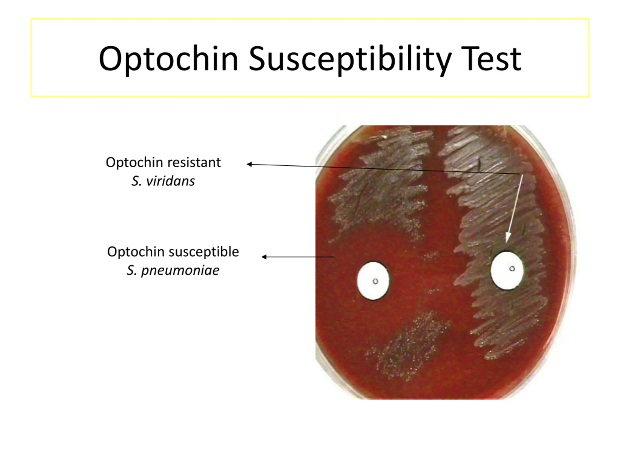 Optochin Susceptibility Test Optochin resistant S. viridans Optochin susceptible S. pneumoniae