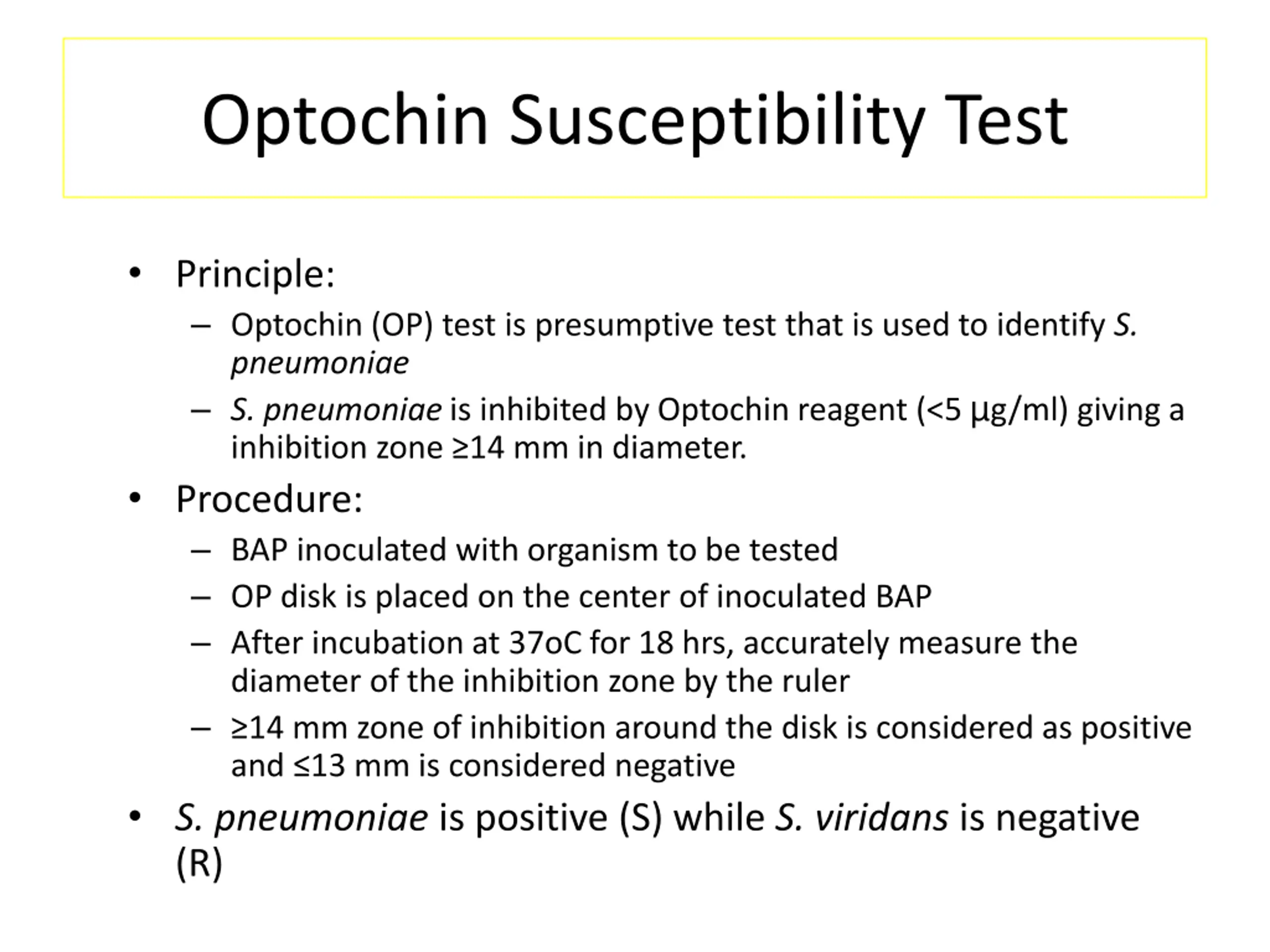 Optochin Susceptibility Test Principle: Optochin (OP) test is presumptive test that is used to identify S. pneumoniae S. pneumoniaeis inhibited by Optochin reagent (<5 g/ml) giving a inhibition zone 14 mm in diameter. Procedure: BAP inoculated with organism to be tested OP disk is placed on the center of inoculated BAP After incubation at 37oC for 18 hrs, accurately measure the diameter of the inhibition zone by the ruler 14 mm zone of inhibition around the disk is considered as positive and 13 mm is considered negative S. pneumoniae is positive (S) while S. viridans is negative (R)
