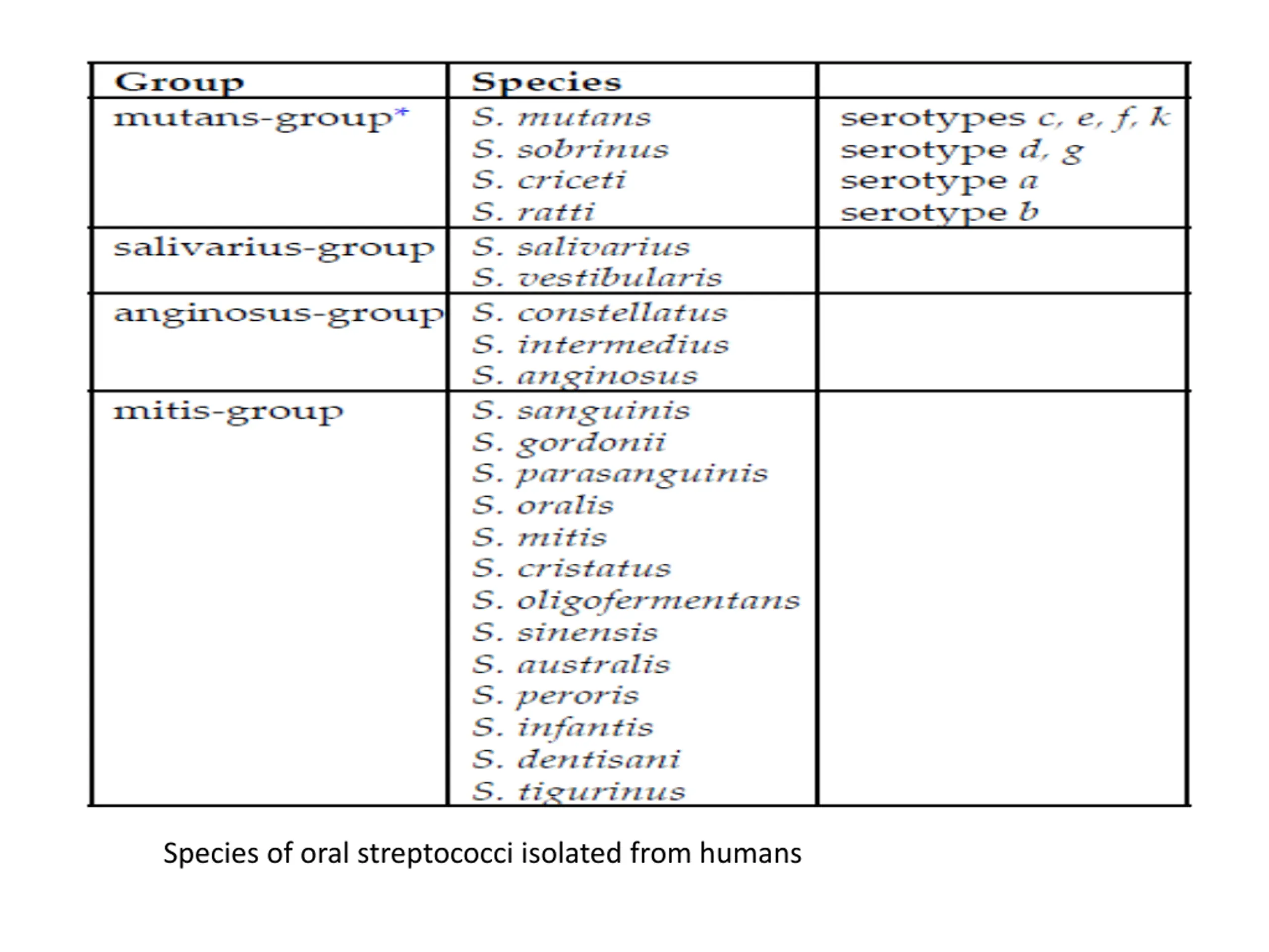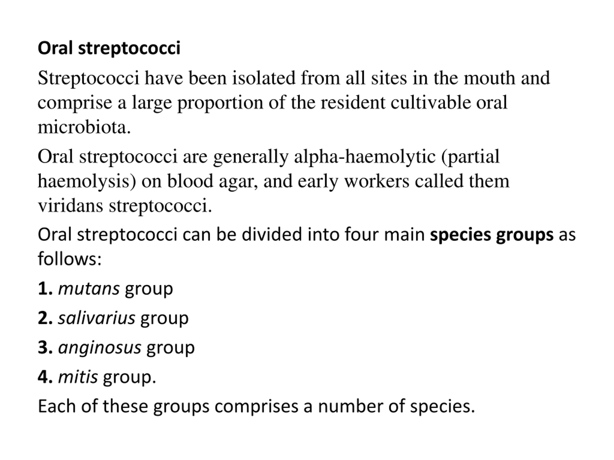 Oral streptococci Streptococci have been isolated from all sites in the mouth and comprise a large proportion of the resident cultivable oral microbiota. Oral streptococci are generally alpha-haemolytic (partial haemolysis) on blood agar, and early workers called them viridans streptococci. Oral streptococci can be divided into four main species groups as follows: 1. mutans group 2. salivarius group 3. anginosus group 4. mitis group. Each of these groups comprises a number of species.
