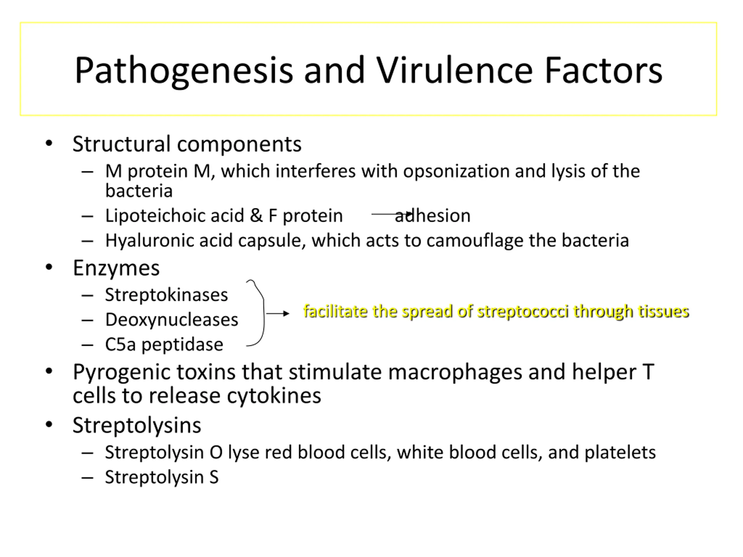 Pathogenesis and Virulence Factors Structural components M protein M, which interferes with opsonization and lysis of the bacteria Lipoteichoic acid & F protein adhesion Hyaluronic acid capsule, which acts to camouflage the bacteria Enzymes Streptokinases Deoxynucleases C5a peptidase Pyrogenic toxins that stimulate macrophages and helper T cells to release cytokines Streptolysins Streptolysin O lyse red blood cells, white blood cells, and platelets Streptolysin S facilitate the spread of streptococci through tissues