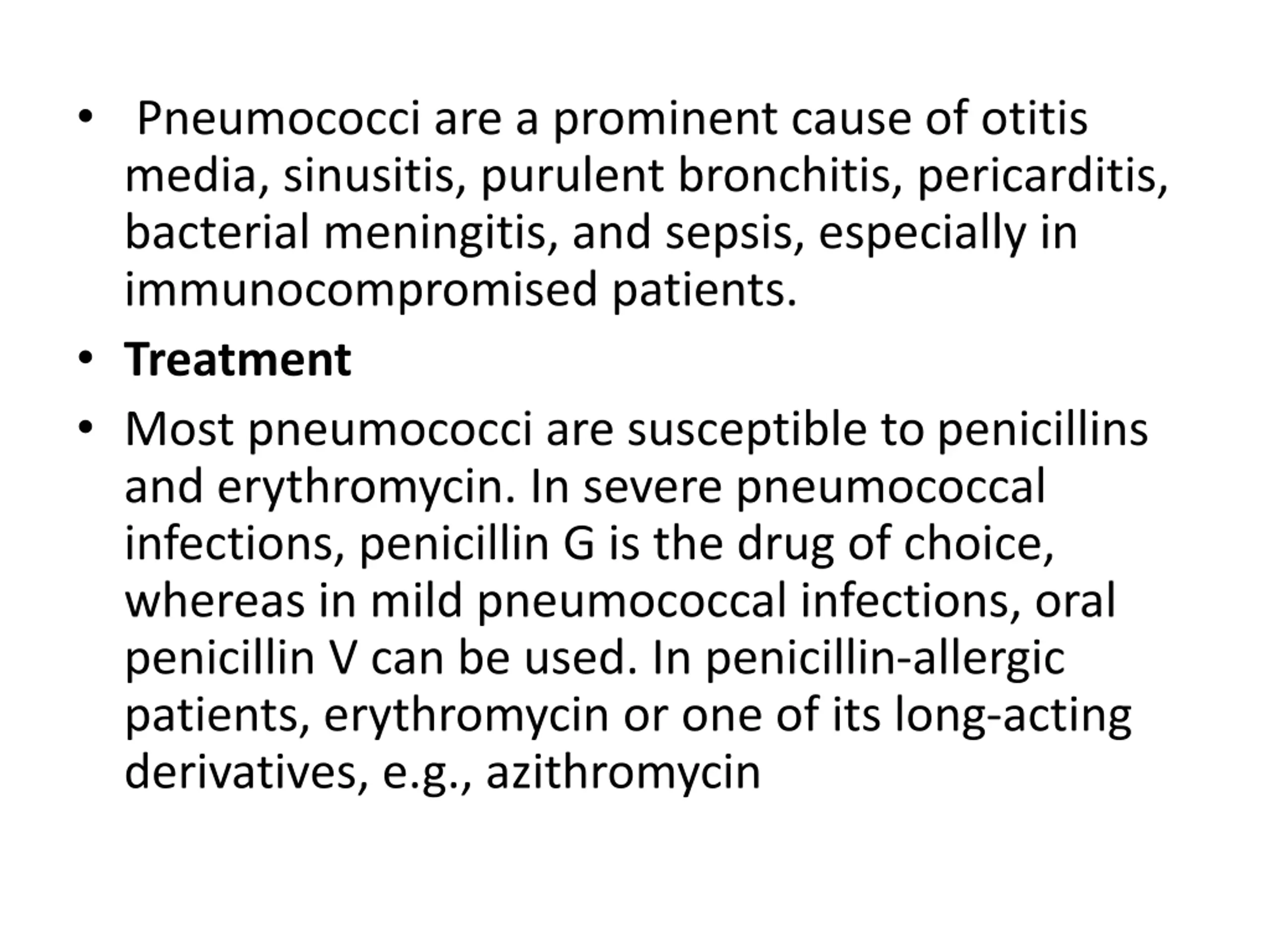 Pneumococci are a prominent cause of otitis media, sinusitis, purulent bronchitis, pericarditis, bacterial meningitis, and sepsis, especially in immunocompromised patients. Treatment Most pneumococci are susceptible to penicillins and erythromycin. In severe pneumococcal infections, penicillin G is the drug of choice, whereas in mild pneumococcal infections, oral penicillin V can be used. In penicillin-allergic patients, erythromycin or one of its long-acting derivatives, e.g., azithromycin