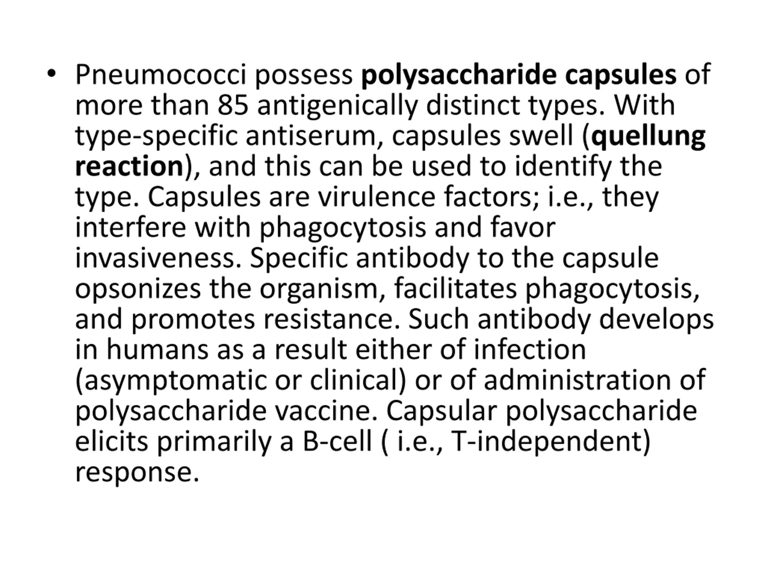 Pneumococci possess polysaccharide capsules of more than 85 antigenically distinct types. With type-specific antiserum, capsules swell (quellung reaction), and this can be used to identify the type. Capsules are virulence factors; i.e., they interfere with phagocytosis and favor invasiveness. Specific antibody to the capsule opsonizes the organism, facilitates phagocytosis, and promotes resistance. Such antibody develops in humans as a result either of infection (asymptomatic or clinical) or of administration of polysaccharide vaccine. Capsular polysaccharide elicits primarily a B-cell ( i.e., T-independent) response.
