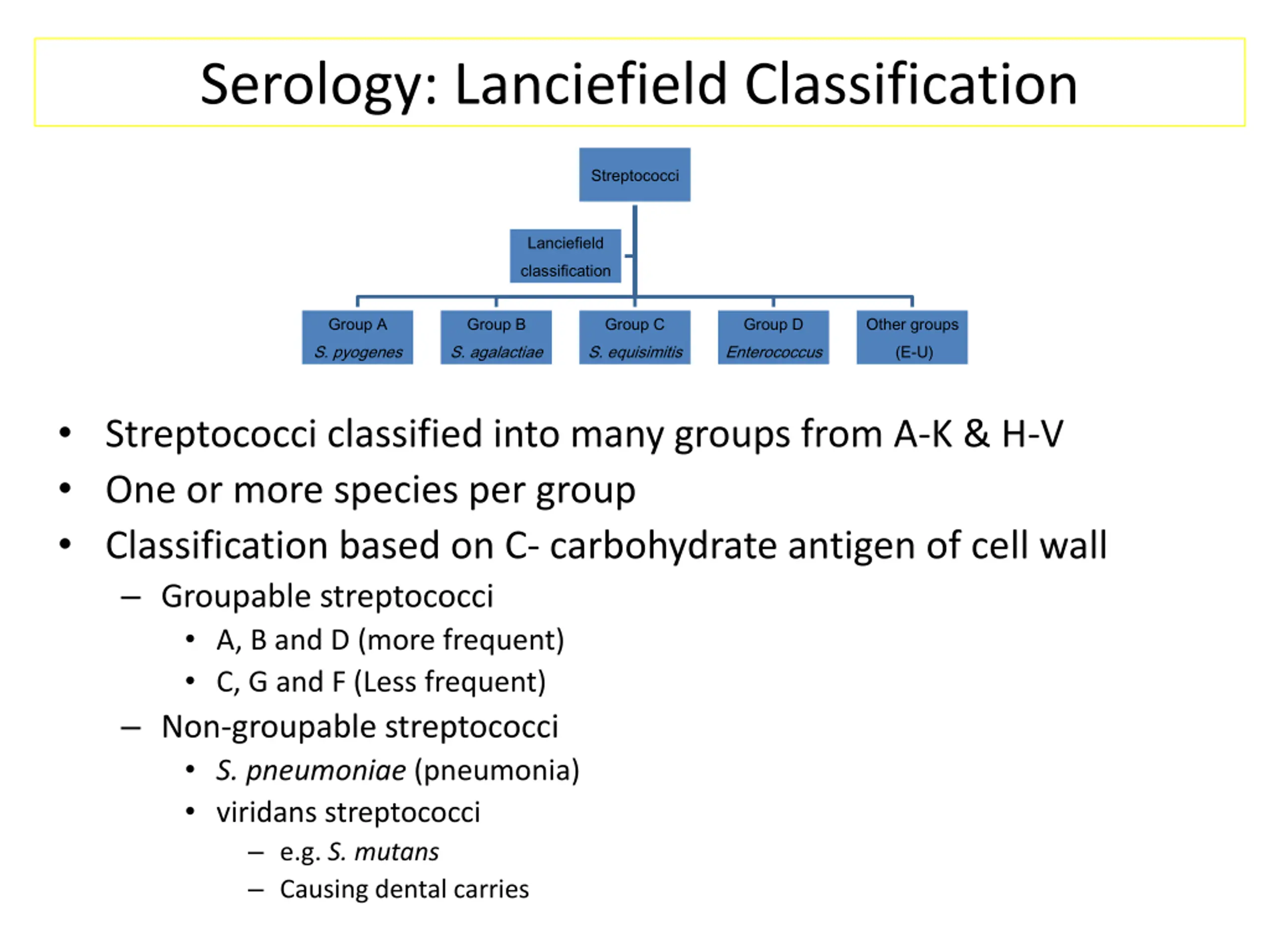 Serology: Lanciefield Classification Streptococci Lanciefield classification Group A S. pyogenes Group B S. agalactiae Group C S. equisimitis Group D Enterococcus Other groups (E-U) Streptococci classified into many groups from A-K & H-V One or more species per group Classification based on C- carbohydrate antigen of cell wall Groupable streptococci A, B and D (more frequent) C, G and F (Less frequent) Non-groupable streptococci S. pneumoniae (pneumonia) viridans streptococci e.g. S. mutans Causing dental carries
