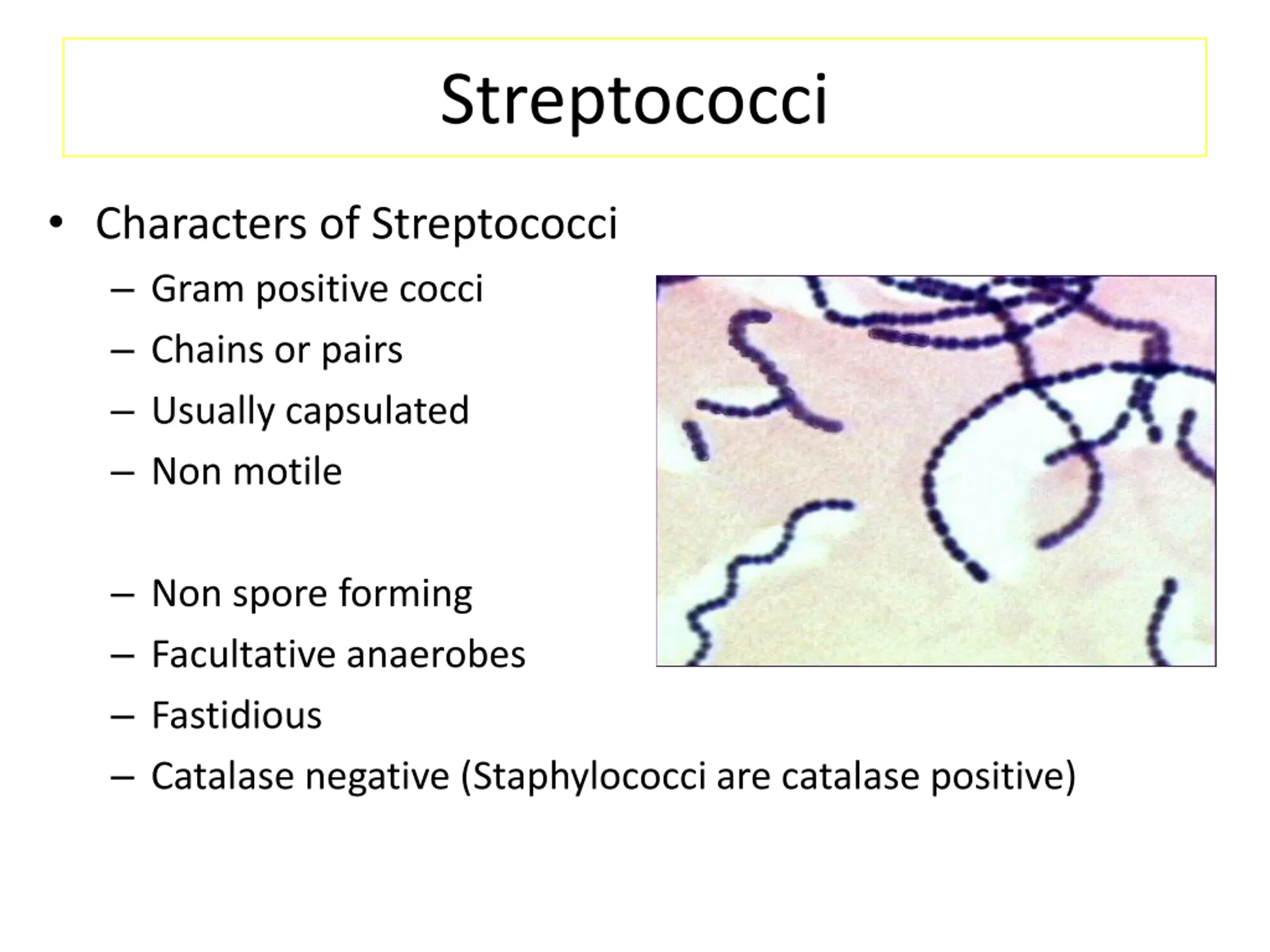 Streptococci Characters of Streptococci Gram positive cocci Chains or pairs Usually capsulated Non motile Non spore forming Facultative anaerobes Fastidious Catalase negative (Staphylococci are catalase positive)