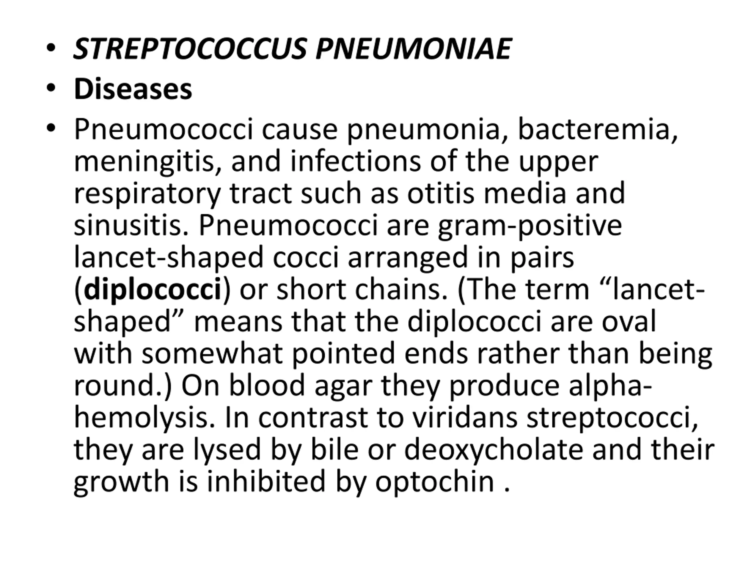 STREPTOCOCCUS PNEUMONIAE Diseases Pneumococci cause pneumonia, bacteremia, meningitis, and infections of the upper respiratory tract such as otitis media and sinusitis. Pneumococci are gram-positive lancet-shaped cocci arranged in pairs (diplococci) or short chains. (The term lancet- shaped means that the diplococci are oval with somewhat pointed ends rather than being round.) On blood agar they produce alpha- hemolysis. In contrast to viridans streptococci, they are lysed by bile or deoxycholate and their growth is inhibited by optochin .