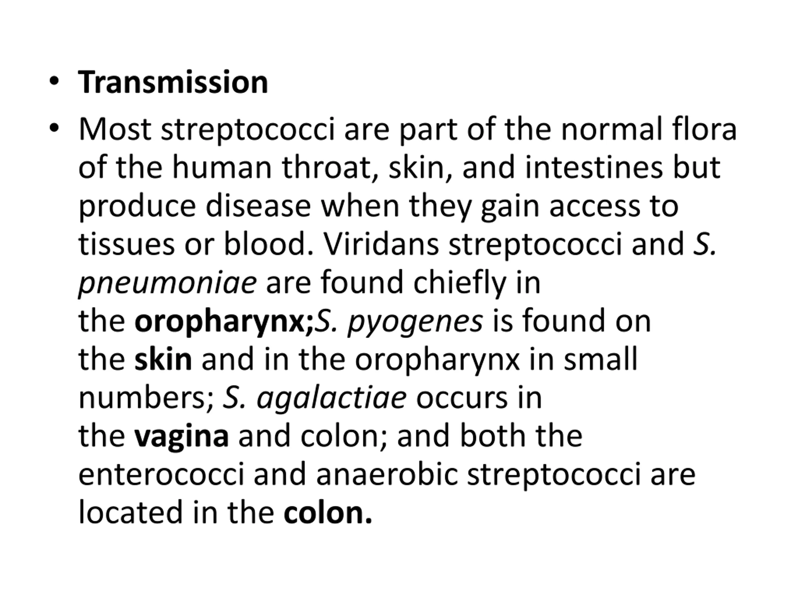Transmission Most streptococci are part of the normal flora of the human throat, skin, and intestines but produce disease when they gain access to tissues or blood. Viridans streptococci and S. pneumoniae are found chiefly in the oropharynx;S. pyogenes is found on the skin and in the oropharynx in small numbers; S. agalactiae occurs in the vagina and colon; and both the enterococci and anaerobic streptococci are located in the colon.