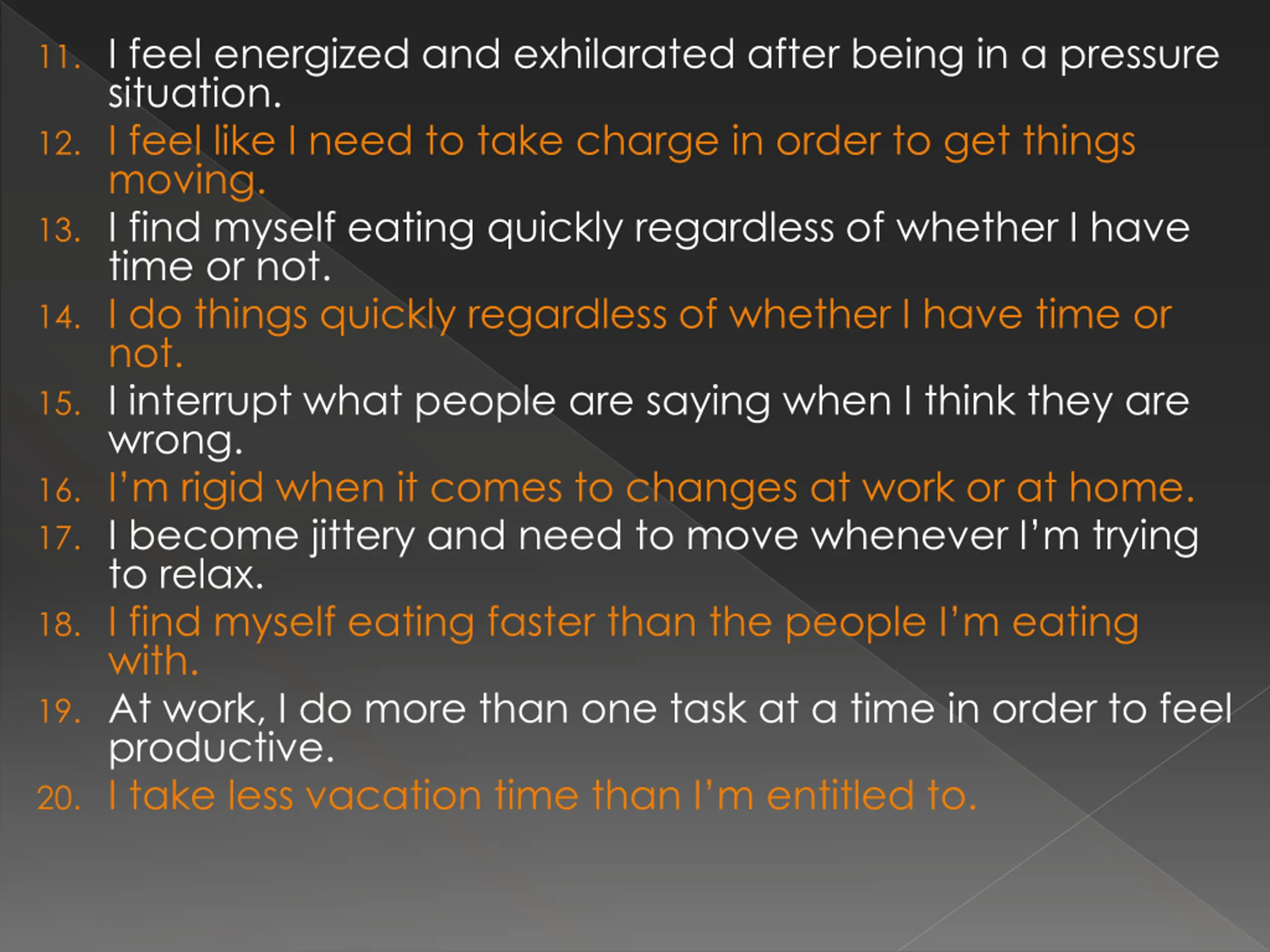 11. I feel energized and exhilarated after being in a pressure situation. 12. I feel like I need to take charge in order to get things moving. 13. I find myself eating quickly regardless of whether I have time or not. 14. I do things quickly regardless of whether I have time or not. 15. I interrupt what people are saying when I think they are wrong. 16. I m rigid when it comes to changes at work or at home. 17. I become jittery and need to move whenever I m trying to relax. 18. I find myself eating faster than the people I m eating with. 19. At work, I do more than one task at a time in order to feel productive. 20. I take less vacation time than I m entitled to.