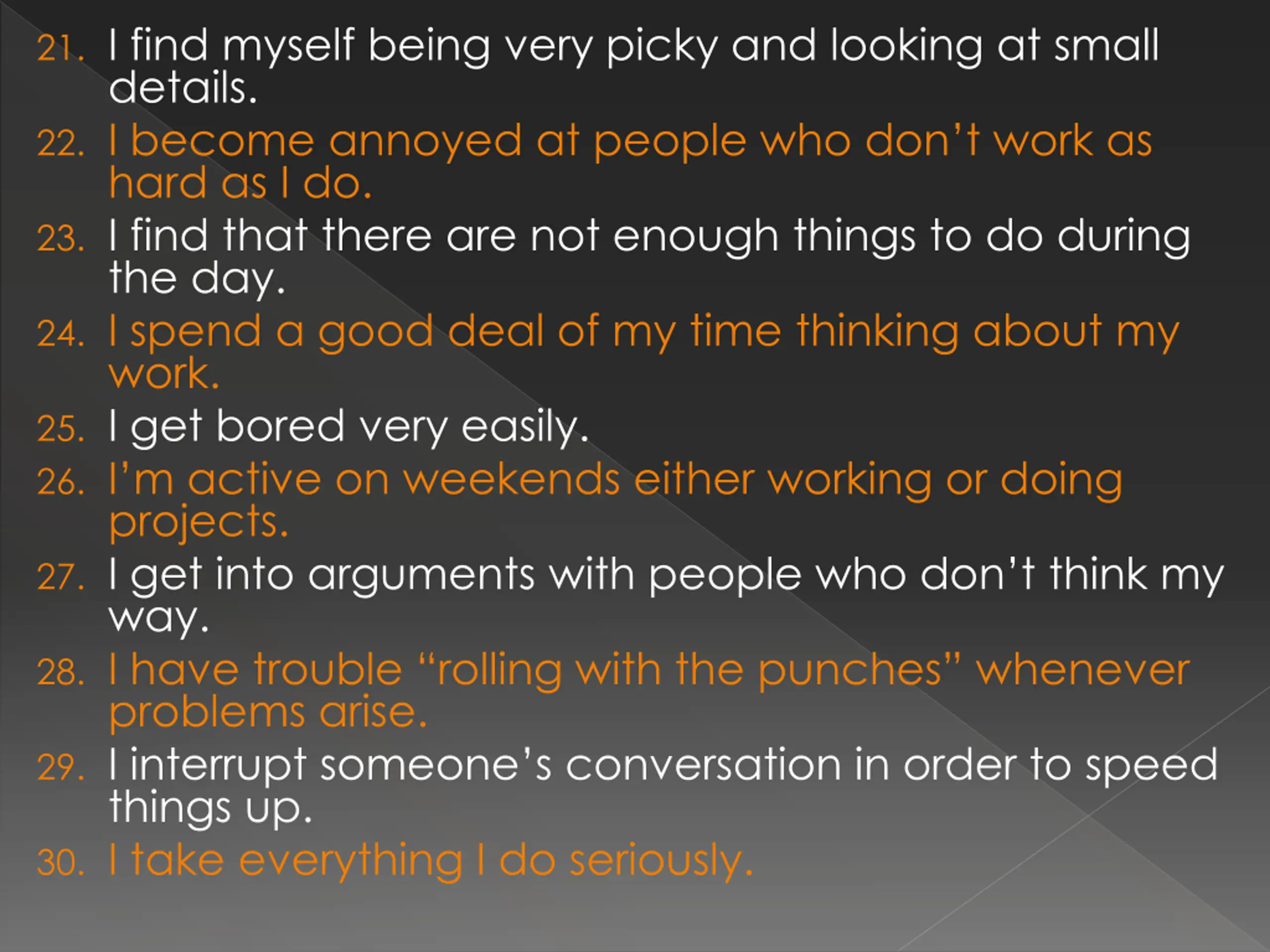 21. I find myself being very picky and looking at small details. 22. I become annoyed at people who don t work as hard as I do. 23. I find that there are not enough things to do during the day. 24. I spend a good deal of my time thinking about my work. 25. I get bored very easily. 26. I m active on weekends either working or doing projects. 27. I get into arguments with people who don t think my way. 28. I have trouble rolling with the punches whenever problems arise. 29. I interrupt someone s conversation in order to speed things up. 30. I take everything I do seriously.