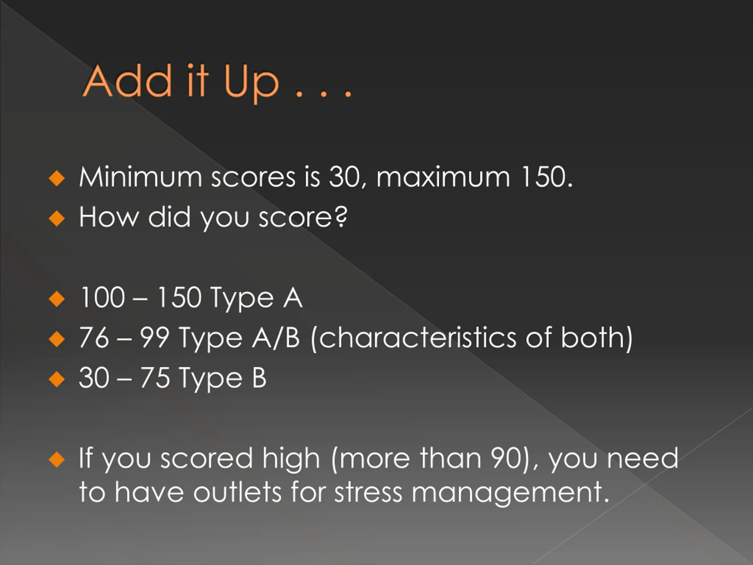 Add it Up . . . Minimum scores is 30, maximum 150. How did you score? 100 150 Type A 76 99 Type A/B (characteristics of both) 30 75 Type B If you scored high (more than 90), you need to have outlets for stress management.