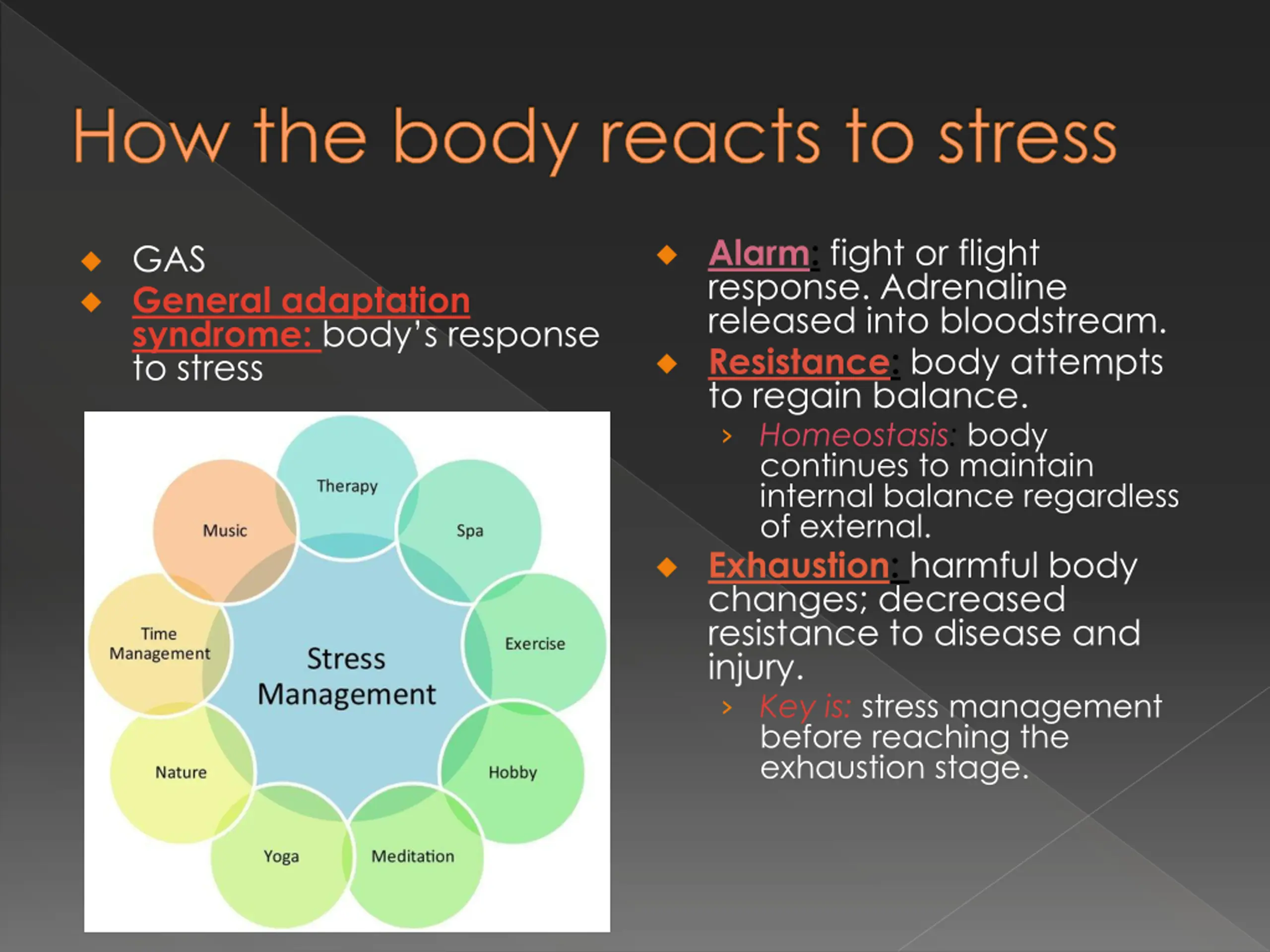 How the body reacts to stress Alarm: fight or flight response. Adrenaline released into bloodstream. Resistance: body attempts to regain balance. Homeostasis: body continues to maintain internal balance regardless of external. Exhaustion: harmful body changes; decreased resistance to disease and injury. Key is: stress management before reaching the exhaustion stage. GAS General adaptation syndrome: body s response to stress
