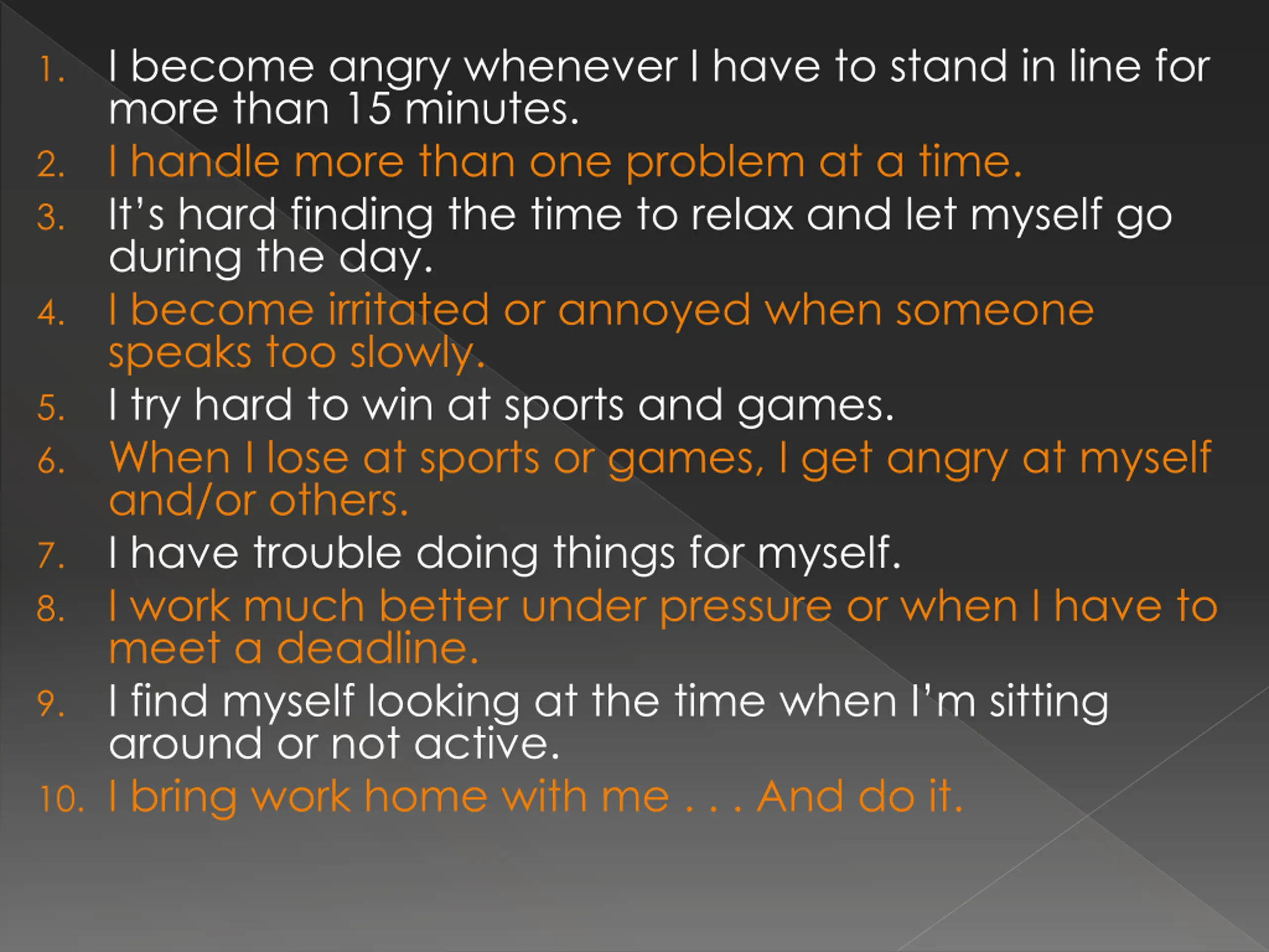 I become angry whenever I have to stand in line for more than 15 minutes. I handle more than one problem at a time. It s hard finding the time to relax and let myself go during the day. I become irritated or annoyed when someone speaks too slowly. I try hard to win at sports and games. When I lose at sports or games, I get angry at myself and/or others. I have trouble doing things for myself. I work much better under pressure or when I have to meet a deadline. I find myself looking at the time when I m sitting around or not active. 10. I bring work home with me . . . And do it. 1. 2. 3. 4. 5. 6. 7. 8. 9.