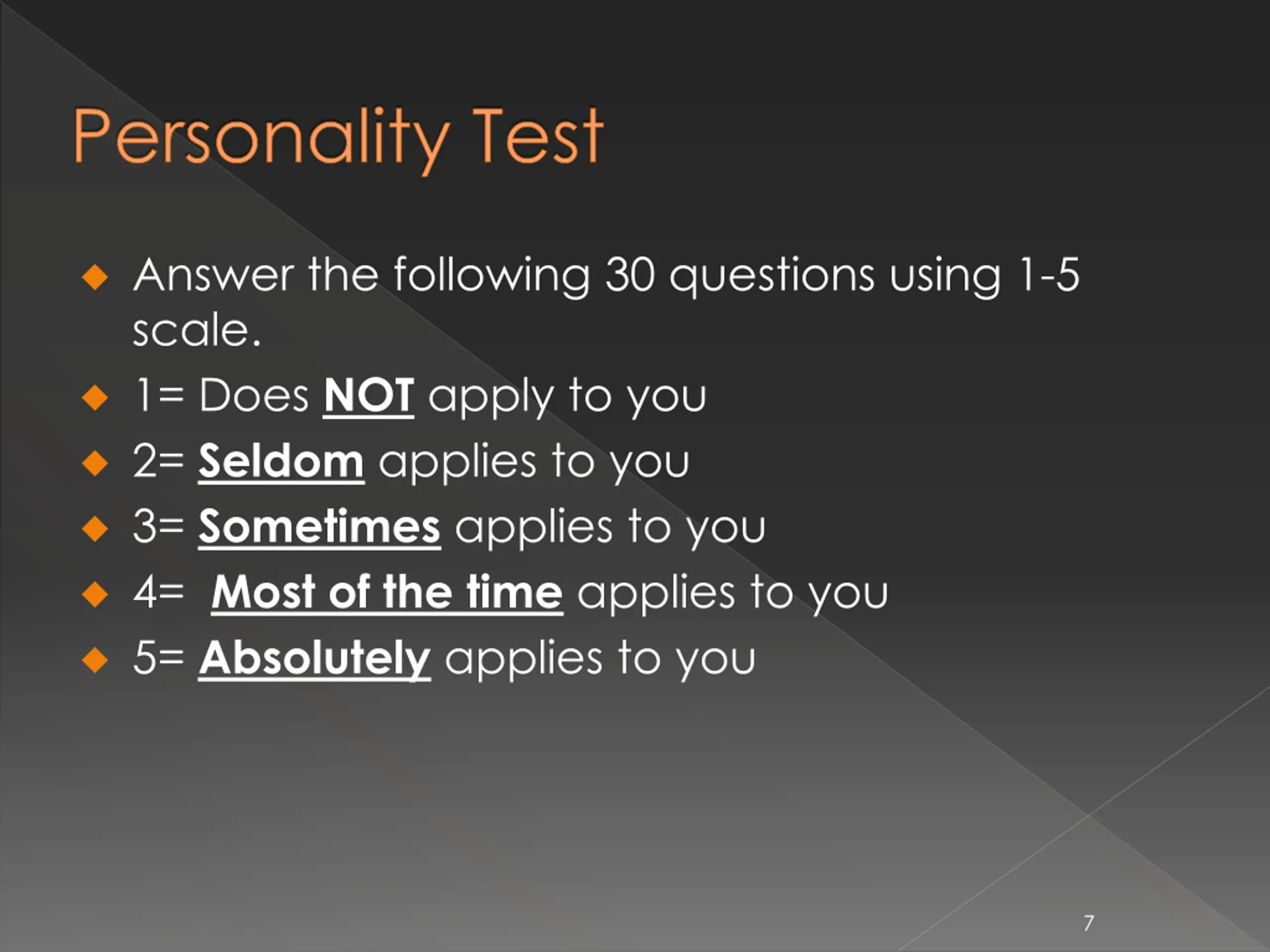 Personality Test Answer the following 30 questions using 1-5 scale. 1= Does NOT apply to you 2= Seldom applies to you 3= Sometimes applies to you 4= Most of the time applies to you 5= Absolutely applies to you 7