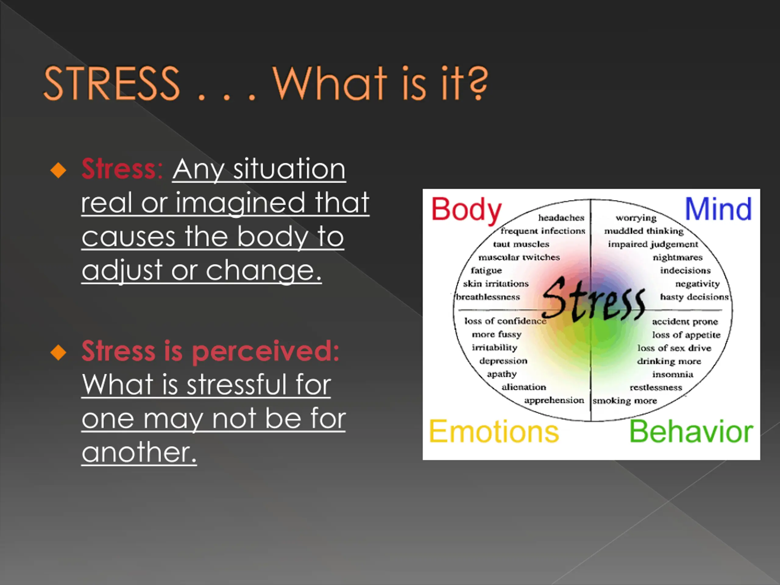 STRESS . . . What is it? Stress: Any situation real or imagined that causes the body to adjust or change. Stress is perceived: What is stressful for one may not be for another.