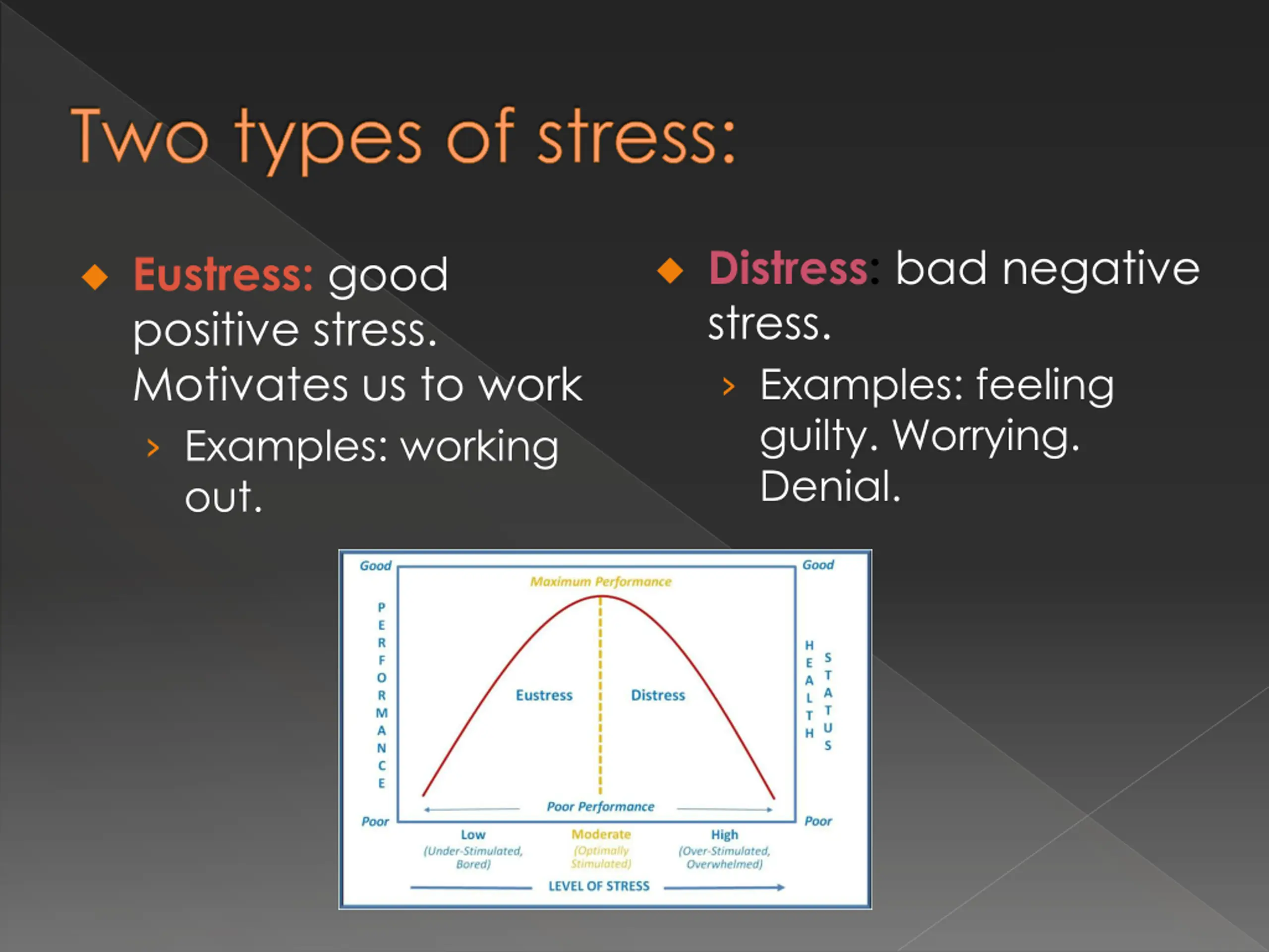 Two types of stress: Distress: bad negative stress. Examples: feeling guilty. Worrying. Denial. Eustress: good positive stress. Motivates us to work Examples: working out.