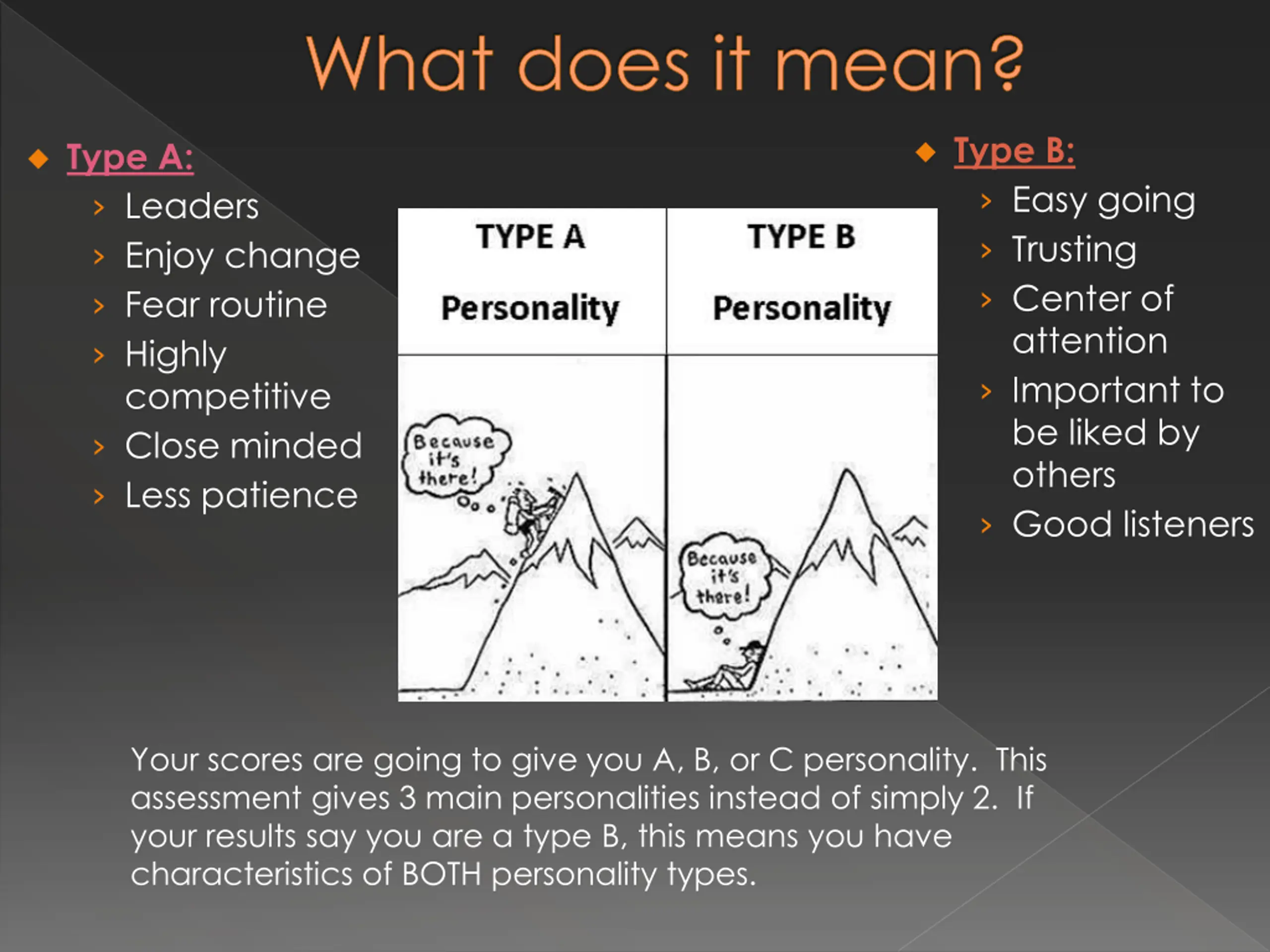 What does it mean? Type B: Easy going Trusting Center of attention Important to be liked by others Good listeners Type A: Leaders Enjoy change Fear routine Highly competitive Close minded Less patience Your scores are going to give you A, B, or C personality. This assessment gives 3 main personalities instead of simply 2. If your results say you are a type B, this means you have characteristics of BOTH personality types.