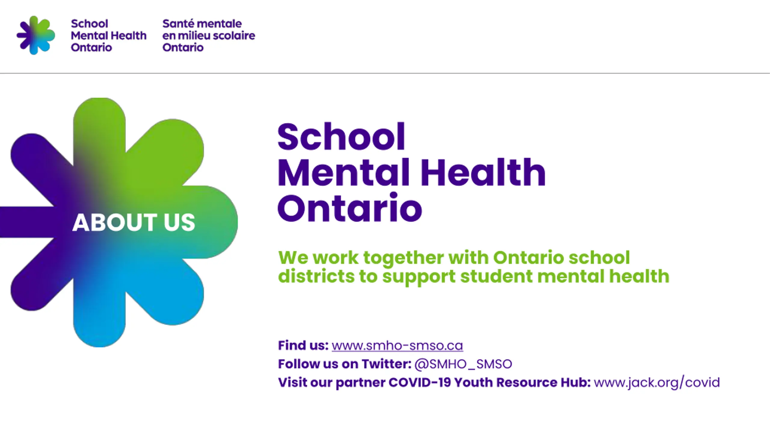 School Mental Health Ontario ABOUT US We work together with Ontario school districts to support student mental health Find us: www.smho-smso.ca Follow us on Twitter: @SMHO_SMSO Visit our partner COVID-19 Youth Resource Hub: www.jack.org/covid