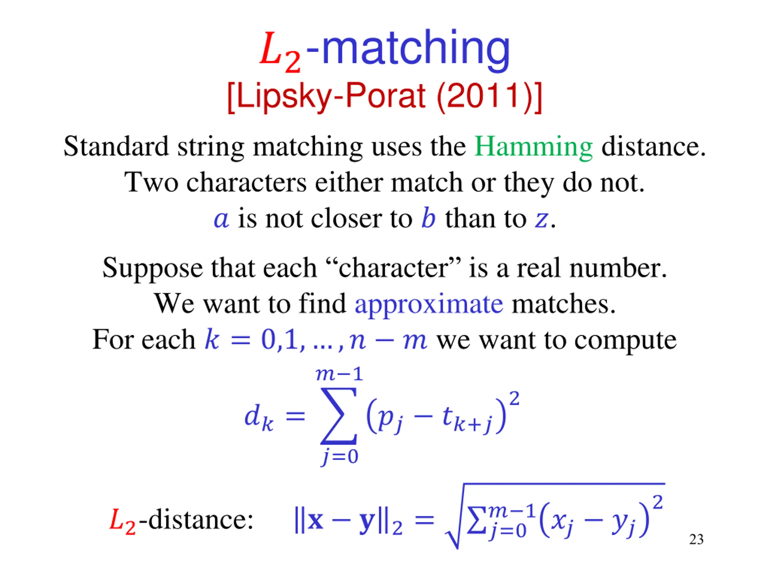?2-matching [Lipsky-Porat (2011)] Standard string matching uses the Hamming distance. Two characters either match or they do not. ? is not closer to ? than to ?. Suppose that each character is a real number. We want to find approximate matches. For each ? = 0,1, ,? ? we want to compute ? 1 2 ??= ?? ??+? ?=0 2 ? 1?? ?? ?2-distance: ? ?2= ?=0 23