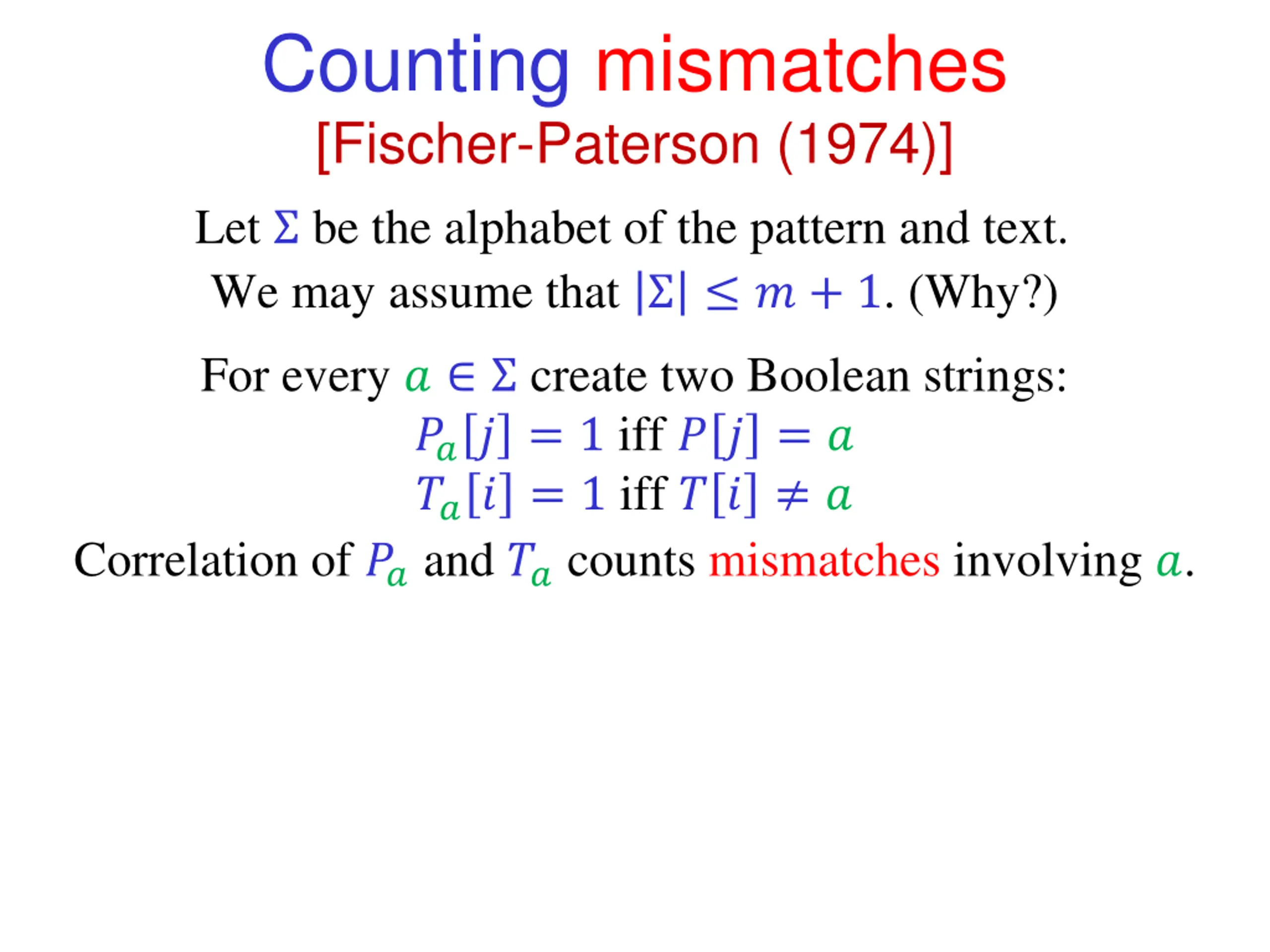 Counting mismatches [Fischer-Paterson (1974)] Let be the alphabet of the pattern and text. We may assume that ? + 1. (Why?) For every ? create two Boolean strings: ??? = 1 iff ? ? = ? ??? = 1 iff ? ? ? Correlation of ??and ??counts mismatches involving ?.