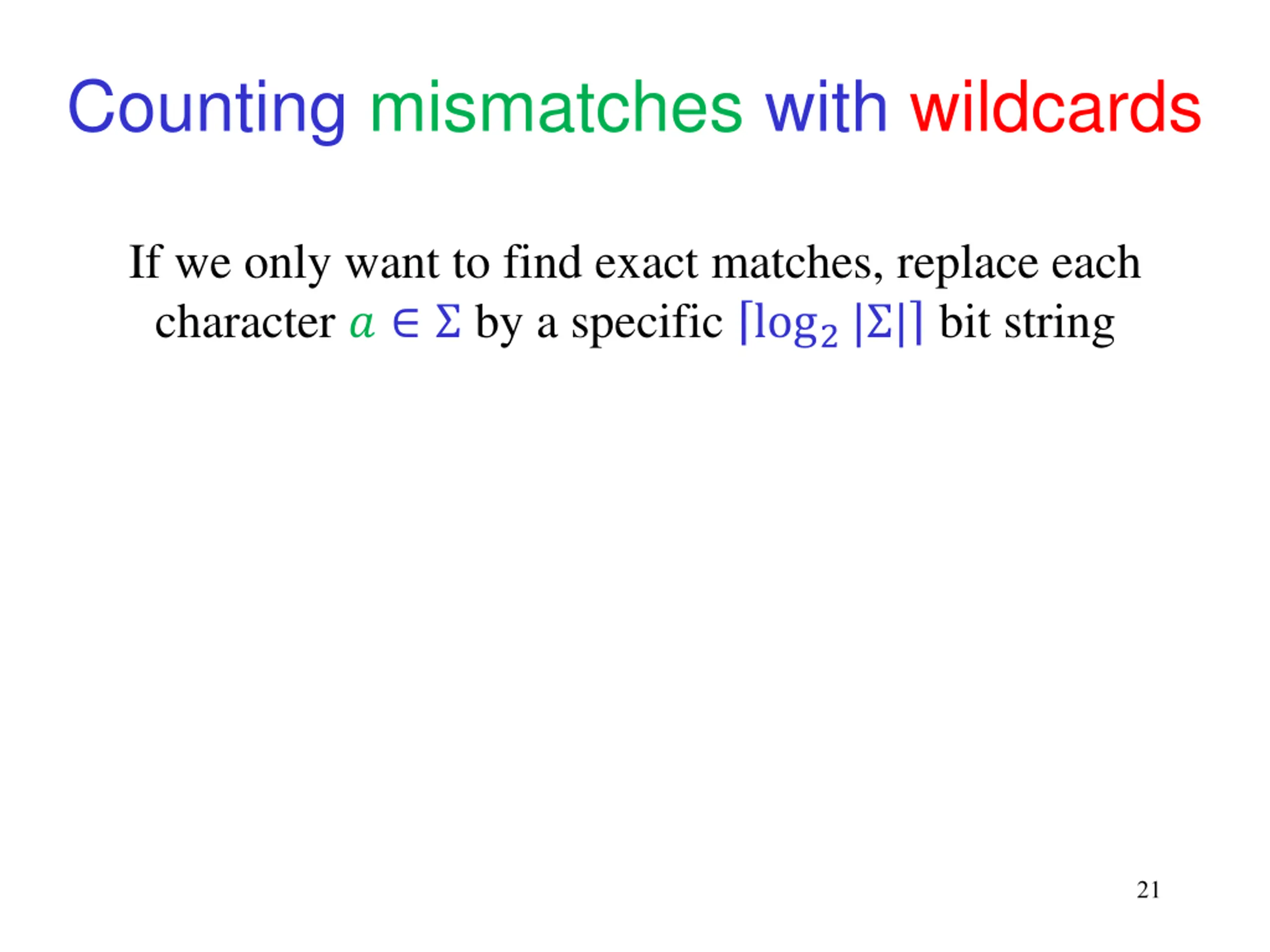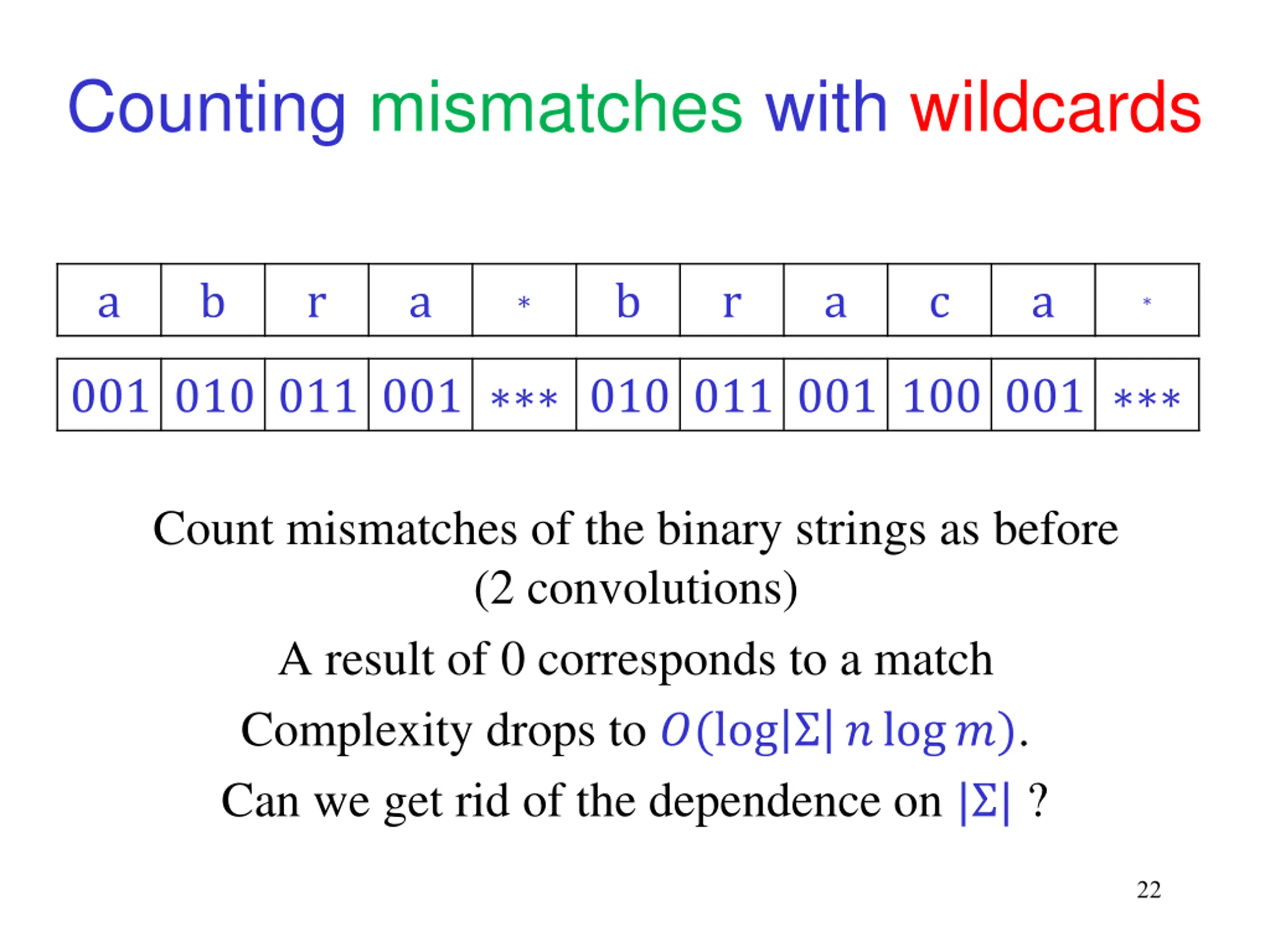 Counting mismatches with wildcards If we only want to find exact matches, replace each character ? by a specific log2| | bit string 21