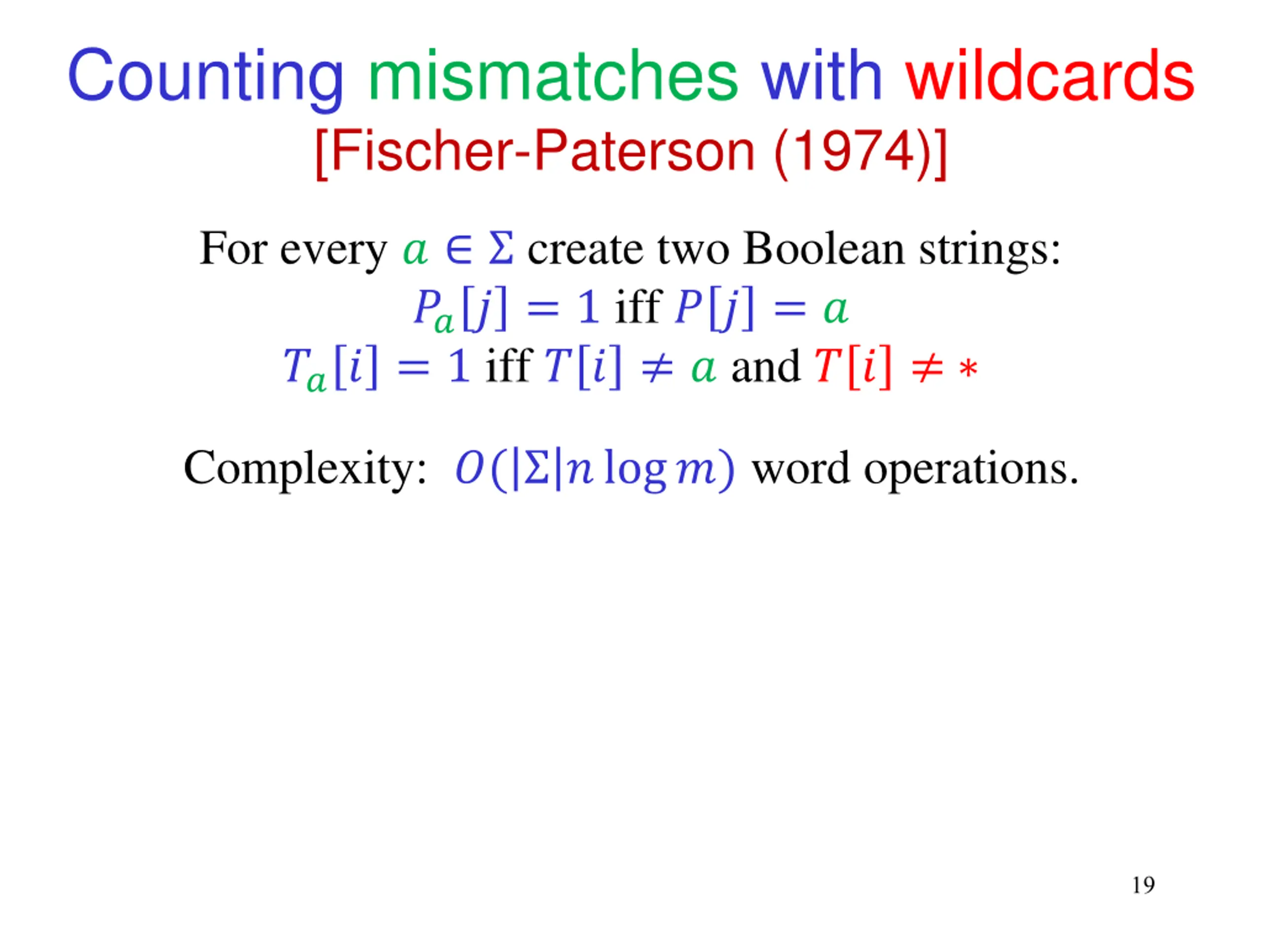 Counting mismatches with wildcards [Fischer-Paterson (1974)] For every ? create two Boolean strings: ??? = 1 iff ? ? = ? ??? = 1 iff ? ? ? and ? ? Complexity: ?( ?log?) word operations. 19