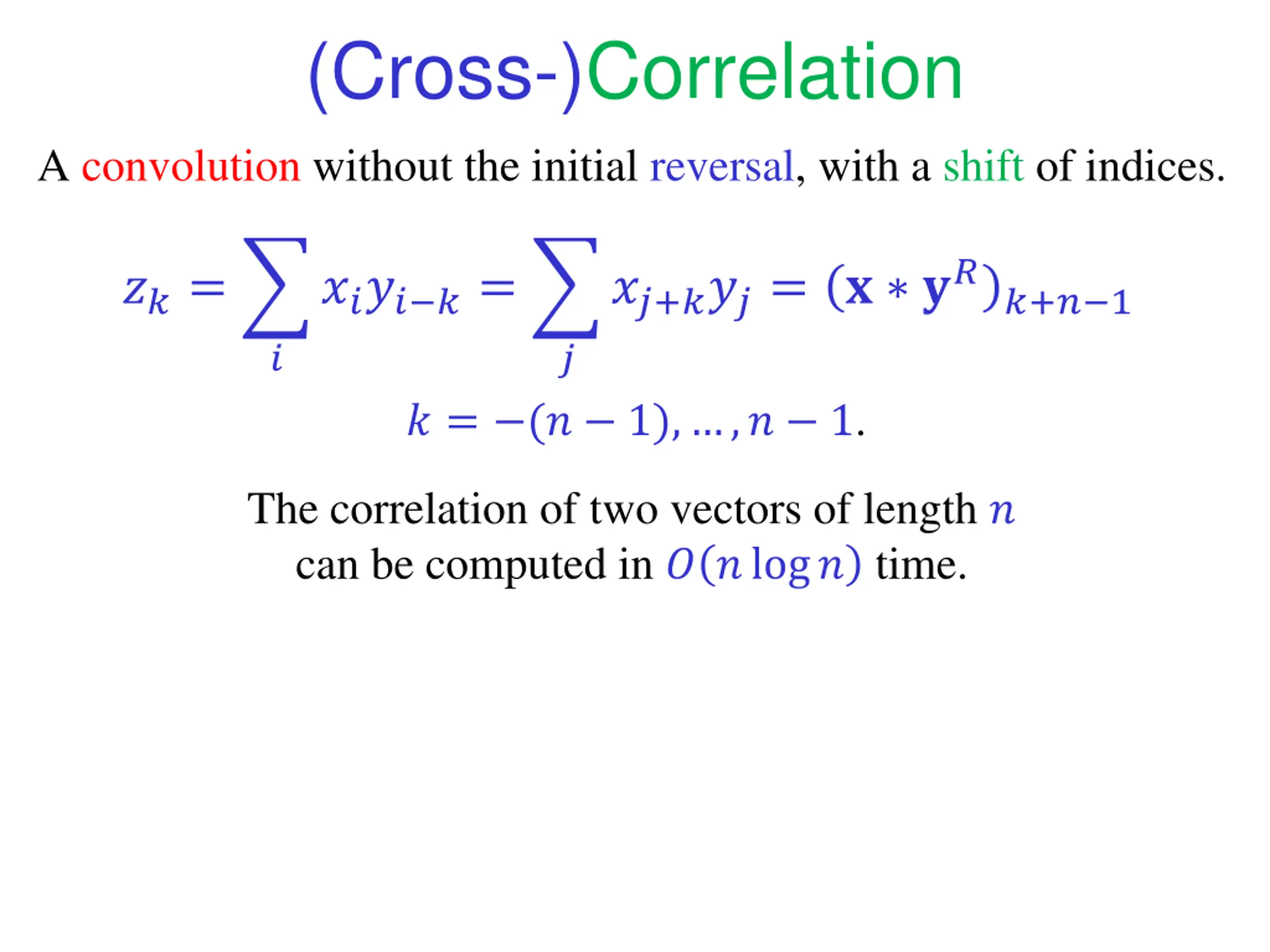 (Cross-)Correlation A convolution without the initial reversal, with a shift of indices. ??+???= ? ?? ??= ???? ?= ?+? 1 ? ? ? = (? 1), ,? 1. The correlation of two vectors of length ? can be computed in ? ?log? time.
