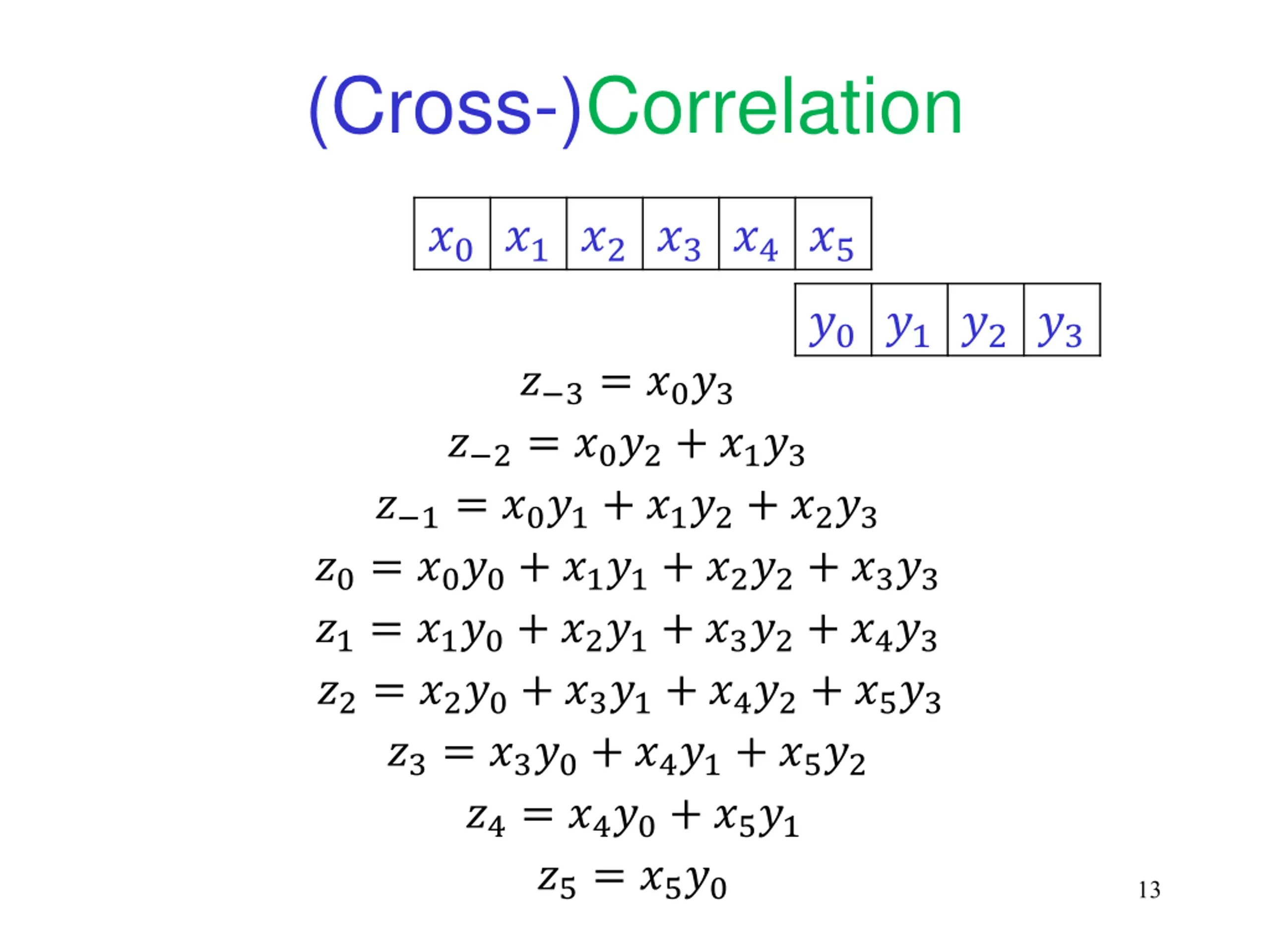 (Cross-)Correlation ?0?1?2?3?4?5 ?0?1?2?3 ? 3= ?0?3 ? 2= ?0?2+ ?1?3 ? 1= ?0?1+ ?1?2+ ?2?3 ?0= ?0?0+ ?1?1+ ?2?2+ ?3?3 ?1= ?1?0+ ?2?1+ ?3?2+ ?4?3 ?2= ?2?0+ ?3?1+ ?4?2+ ?5?3 ?3= ?3?0+ ?4?1+ ?5?2 ?4= ?4?0+ ?5?1 12