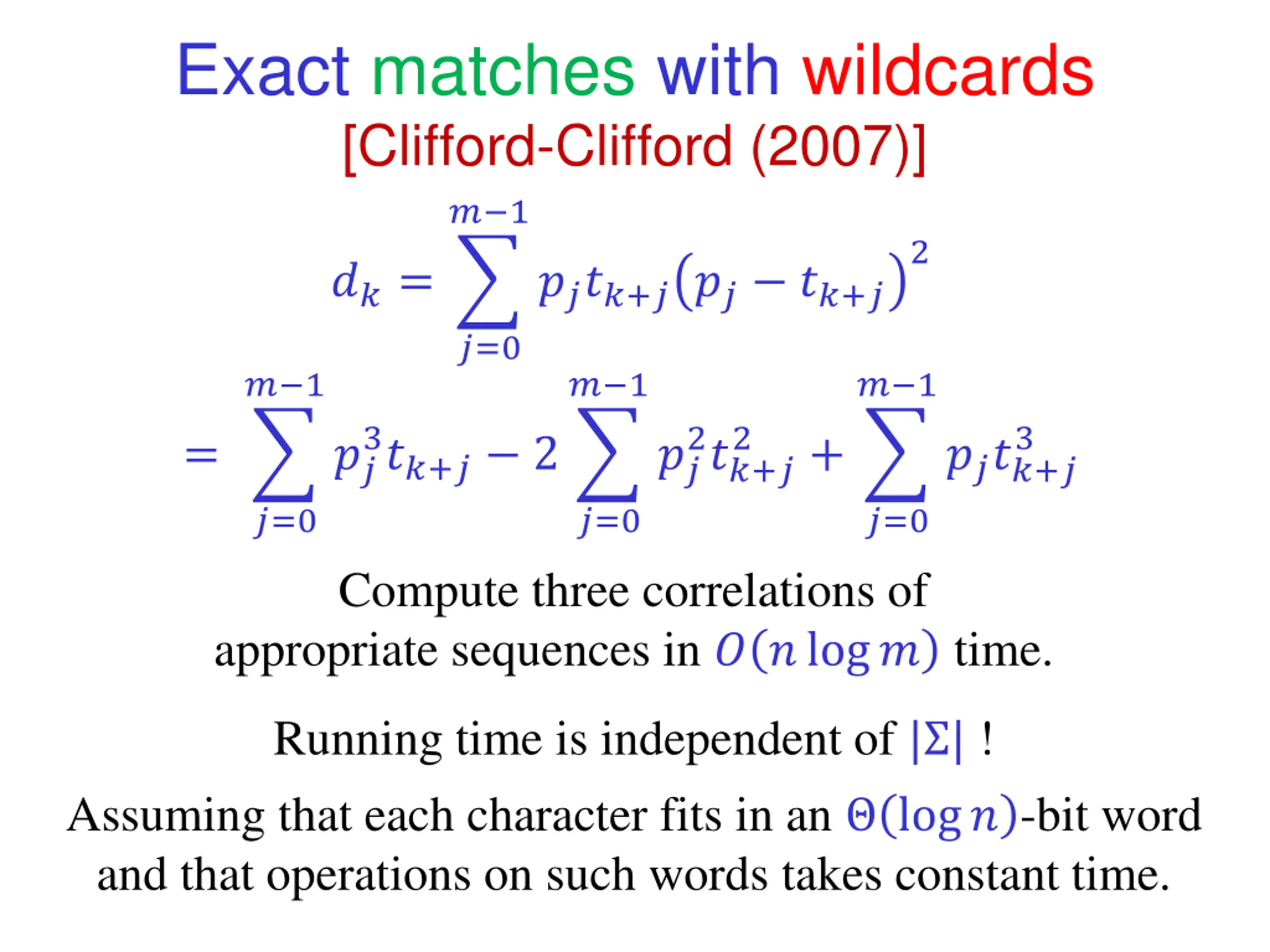Exact matches with wildcards [Clifford-Clifford (2007)] ? 1 2 ??= ????+??? ??+? ?=0 ? 1 ? 1 ? 1 3??+? 2 3 2??+? 2 = ?? ?? + ????+? ?=0 ?=0 ?=0 Compute three correlations of appropriate sequences in ? ?log? time. Running time is independent of | | ! Assuming that each character fits in an log? -bit word and that operations on such words takes constant time.