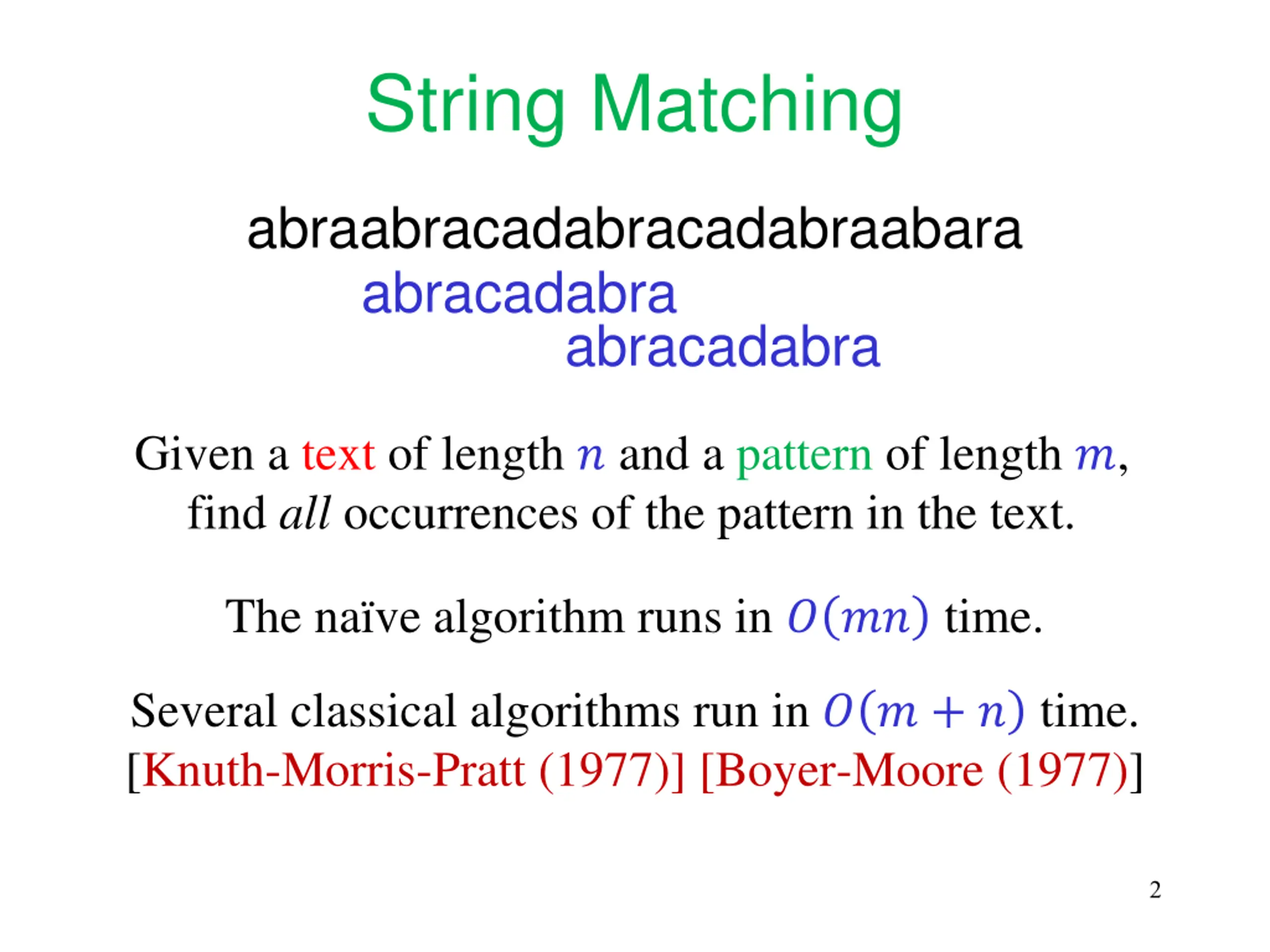 String Matching abraabracadabracadabraabara abracadabra abracadabra Given a text of length ? and a pattern of length ?, find all occurrences of the pattern in the text. The na ve algorithm runs in ? ?? time. Several classical algorithms run in ? ? + ? time. [Knuth-Morris-Pratt (1977)] [Boyer-Moore (1977)] 2