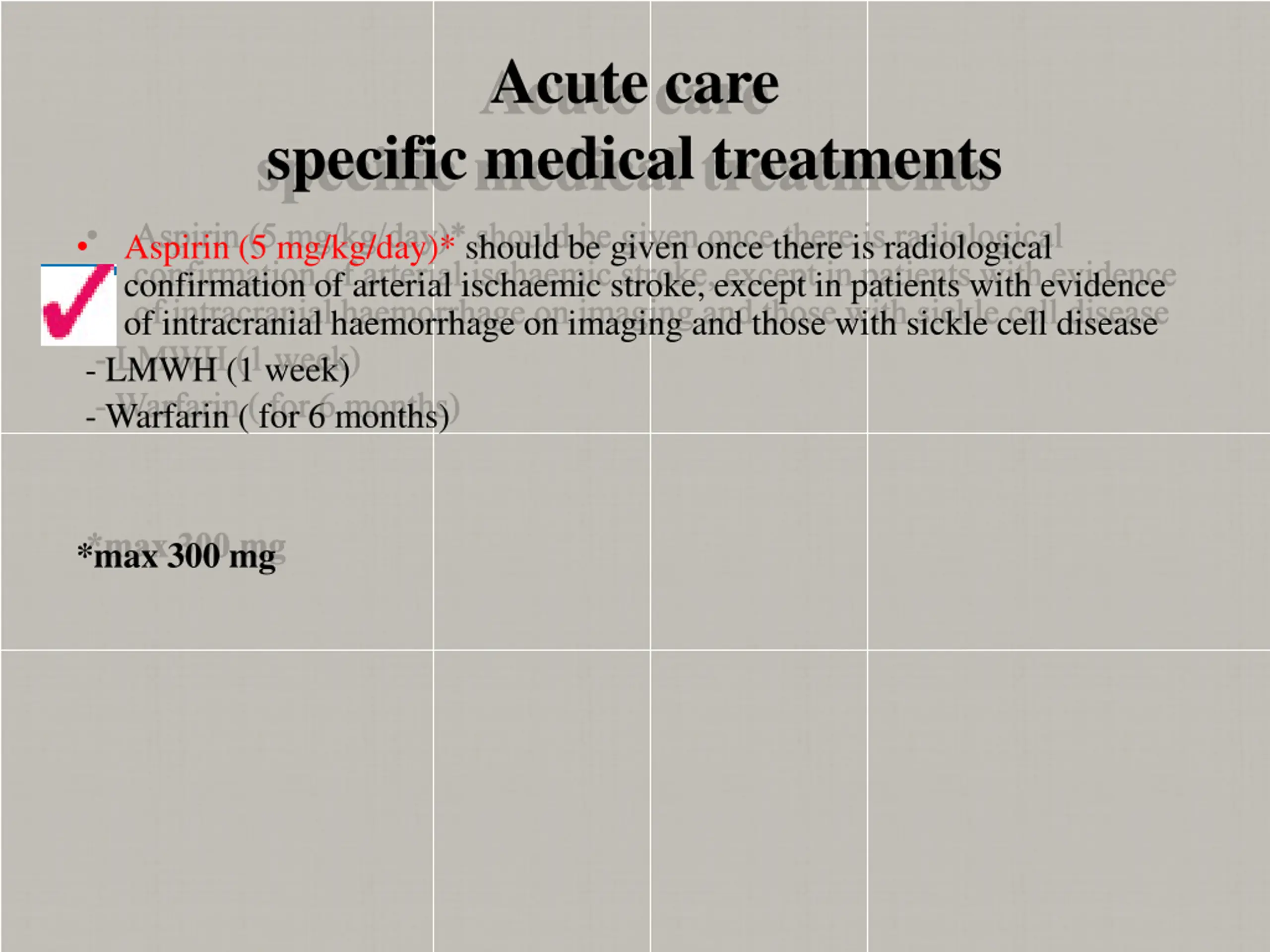 Acute care specific medical treatments Aspirin (5 mg/kg/day)* should be given once there is radiological confirmation of arterial ischaemic stroke, except in patients with evidence of intracranial haemorrhage on imaging and those with sickle cell disease - LMWH (1 week) - Warfarin ( for 6 months) *max 300 mg