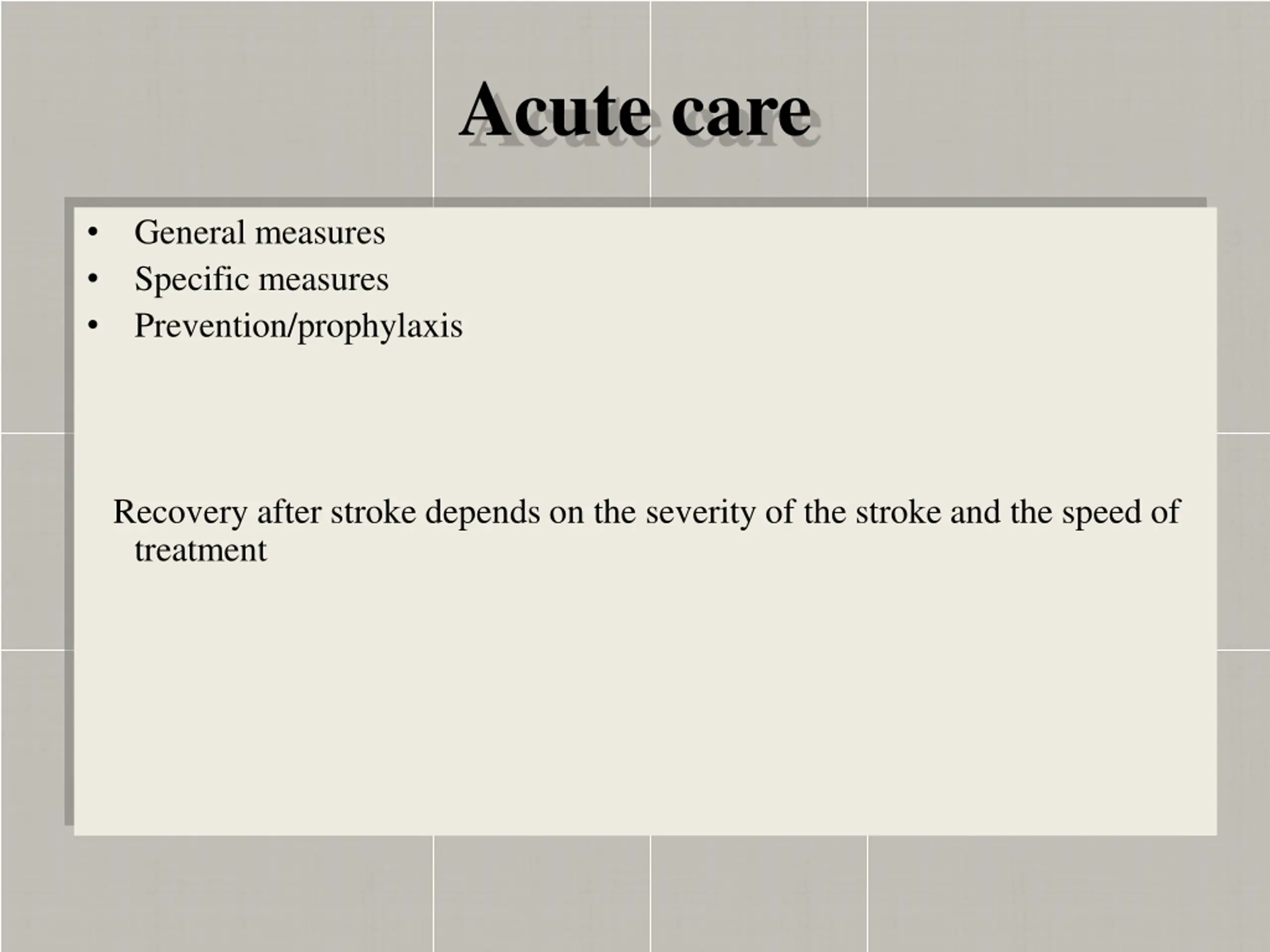Acute care General measures Specific measures Prevention/prophylaxis Recovery after stroke depends on the severity of the stroke and the speed of treatment
