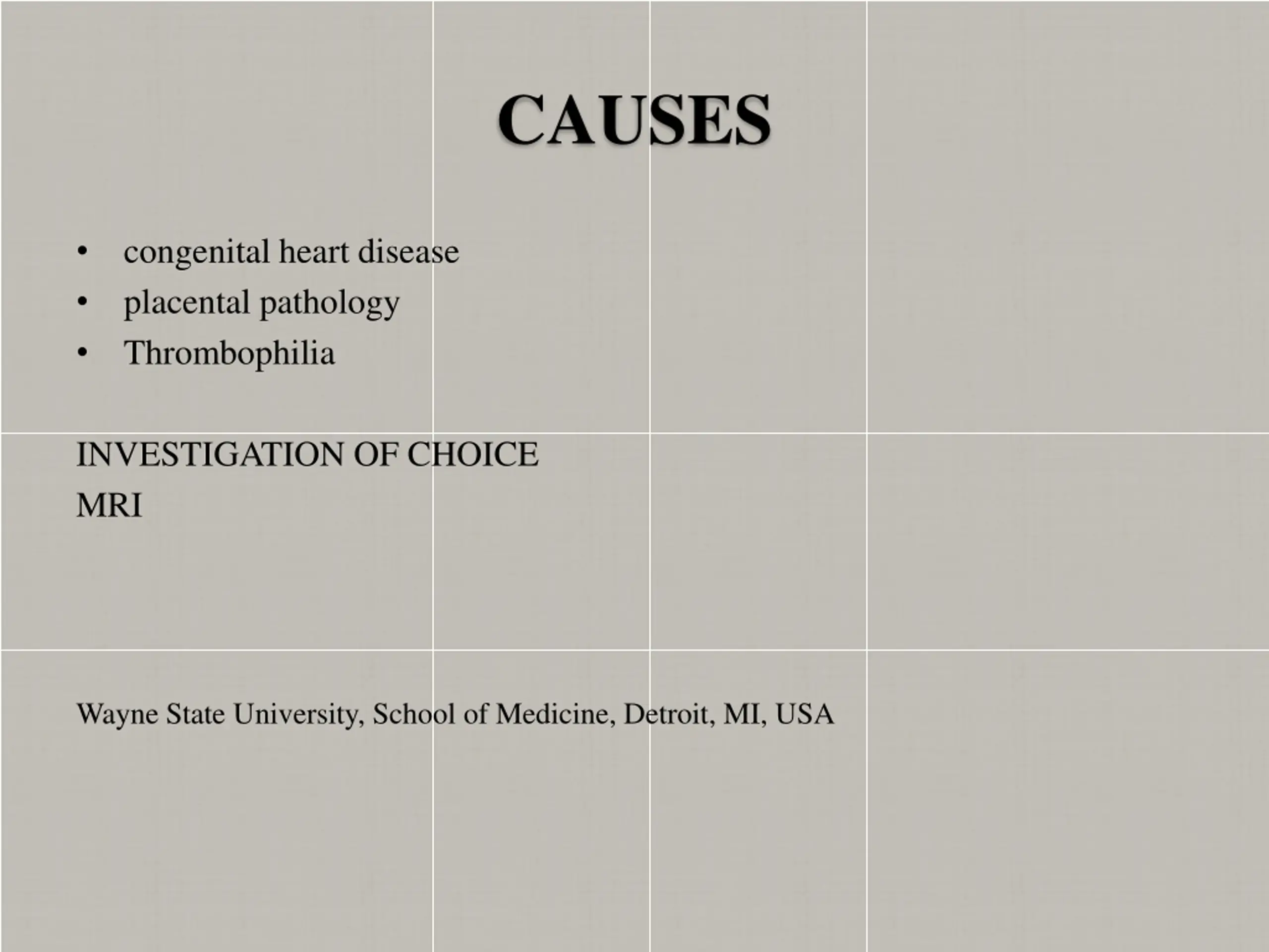 CAUSES congenital heart disease placental pathology Thrombophilia INVESTIGATION OF CHOICE MRI Wayne State University, School of Medicine, Detroit, MI, USA