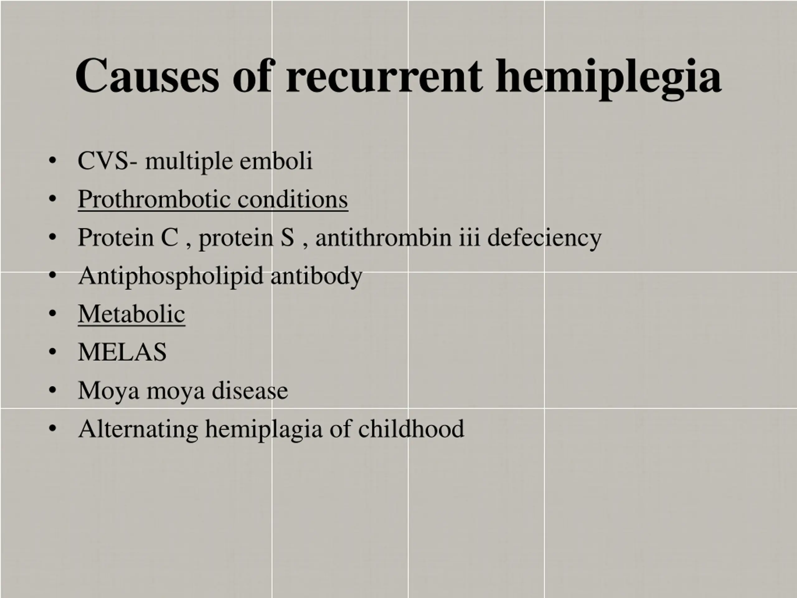 Causes of recurrent hemiplegia CVS- multiple emboli Prothrombotic conditions Protein C , protein S , antithrombin iii defeciency Antiphospholipid antibody Metabolic MELAS Moya moya disease Alternating hemiplagia of childhood