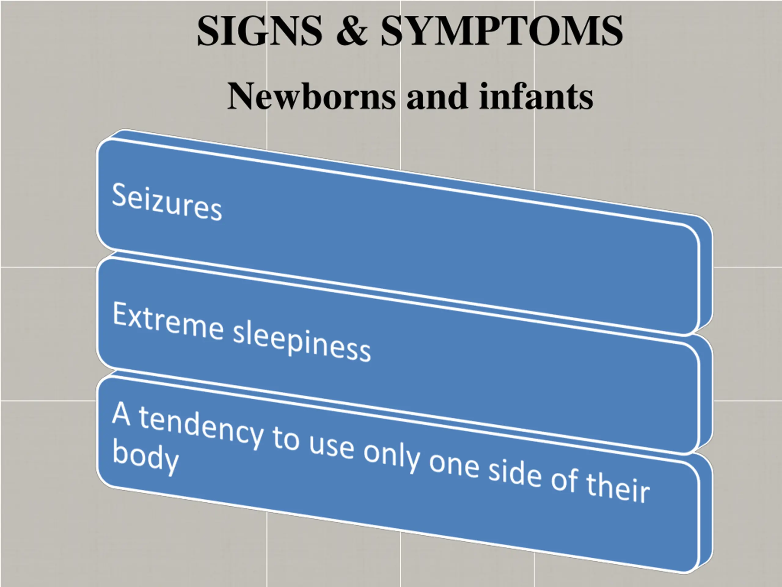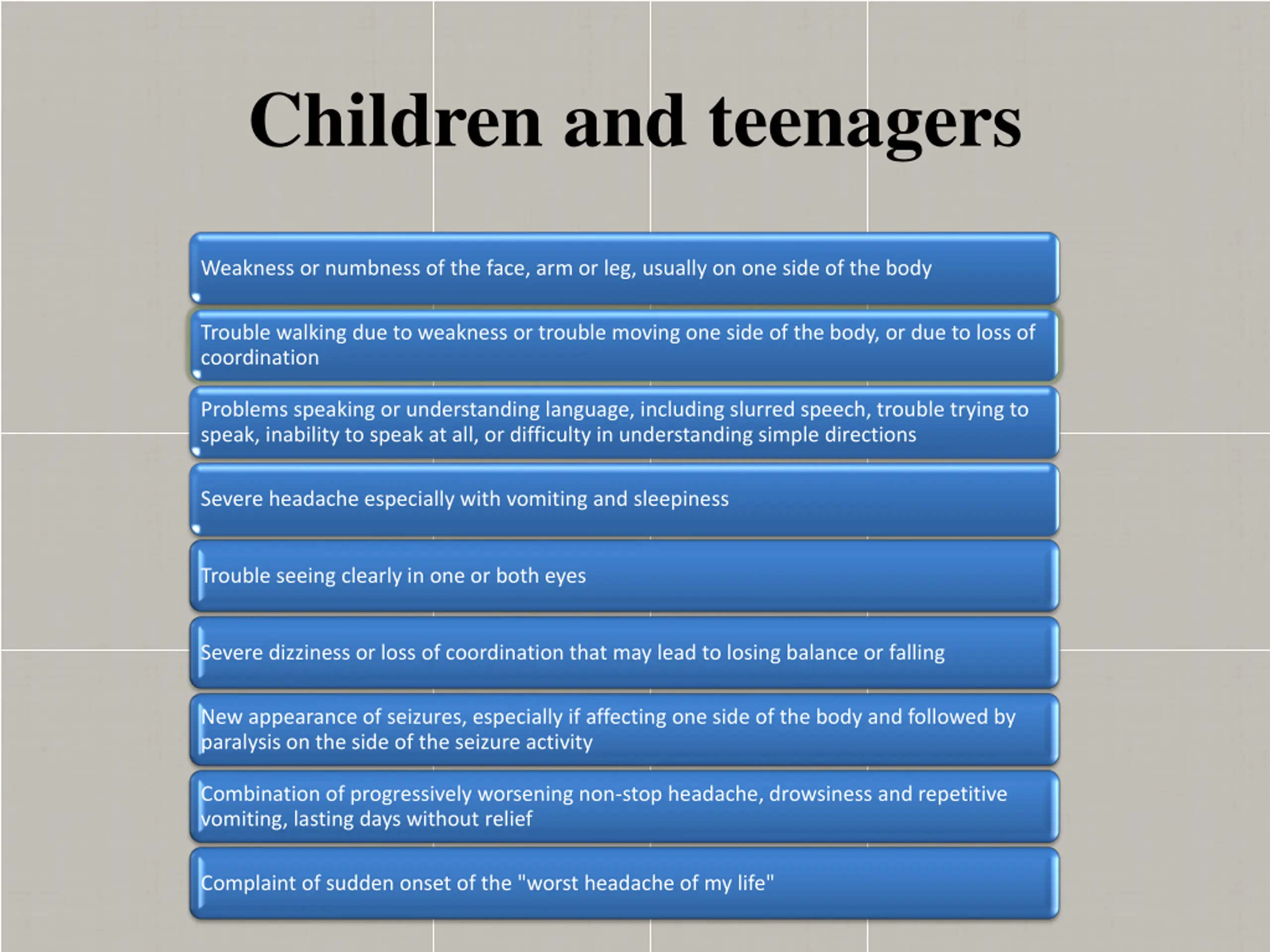 Children and teenagers Weakness or numbness of the face, arm or leg, usually on one side of the body Trouble walking due to weakness or trouble moving one side of the body, or due to loss of coordination Problems speaking or understanding language, including slurred speech, trouble trying to speak, inability to speak at all, or difficulty in understanding simple directions Severe headache especially with vomiting and sleepiness Trouble seeing clearly in one or both eyes Severe dizziness or loss of coordination that may lead to losing balance or falling New appearance of seizures, especially if affecting one side of the body and followed by paralysis on the side of the seizure activity Combination of progressively worsening non-stop headache, drowsiness and repetitive vomiting, lasting days without relief Complaint of sudden onset of the "worst headache of my life"